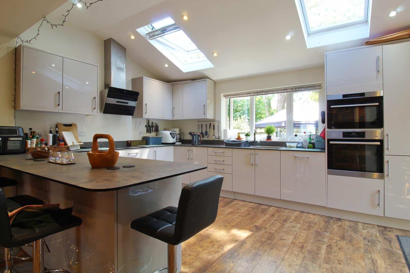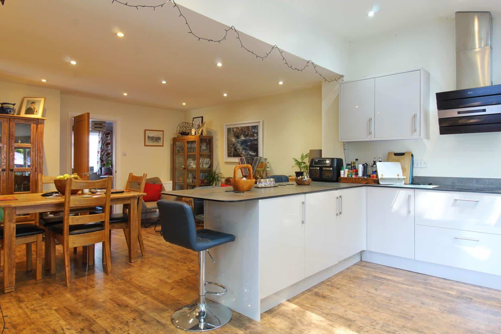 Re-fitted with a stunning range of high gloss high and base level units with contrasting work surfaces and splash back over, stainless steel sink and drainer unit with mixer tap over, integrated dishwasher, fridge and freezer, built in ‘AEG’ electric oven and grill with ‘AEG’ induction hob and modern ‘AEG’ extractor fan over, double glazed window to rear and double glazed French doors to side and opening out to the garden, two skylight windows to rear, wood finish flooring, two radiators, inset spotlights to ceiling and contemporary oak doors to pantry cupboard and utility room.