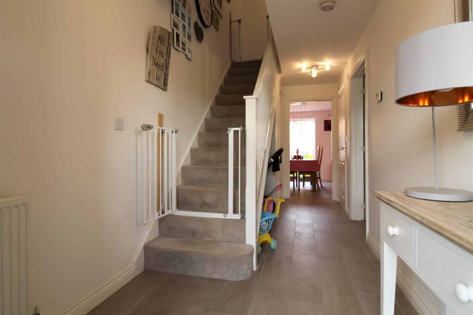 A spacious entrance hall with panel doors to lounge, cloakroom, understairs storage cupboard and kitchen/ dining room, stairs rising to first floor landing with spindled balustrade and large storage recess under, radiator and wood finish tiling to floor (extending through to the cloakroom and kitchen/dining room).