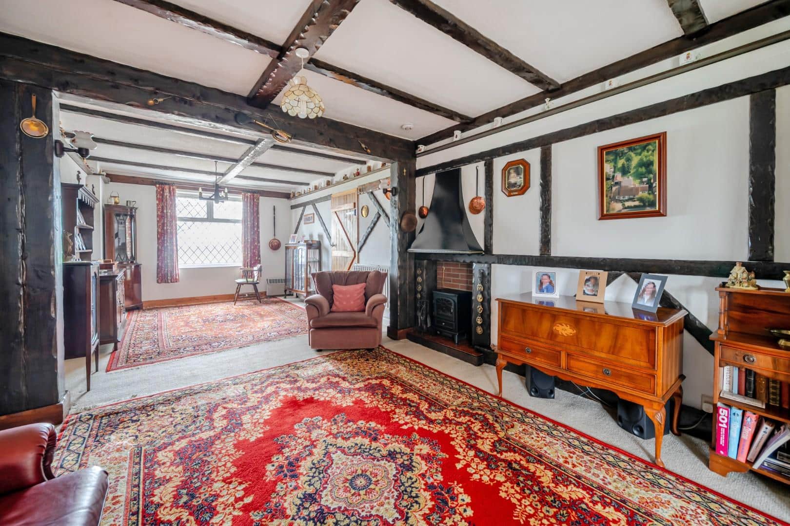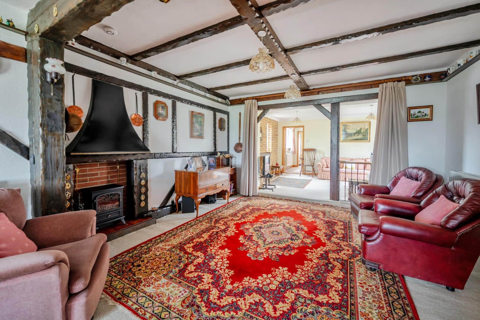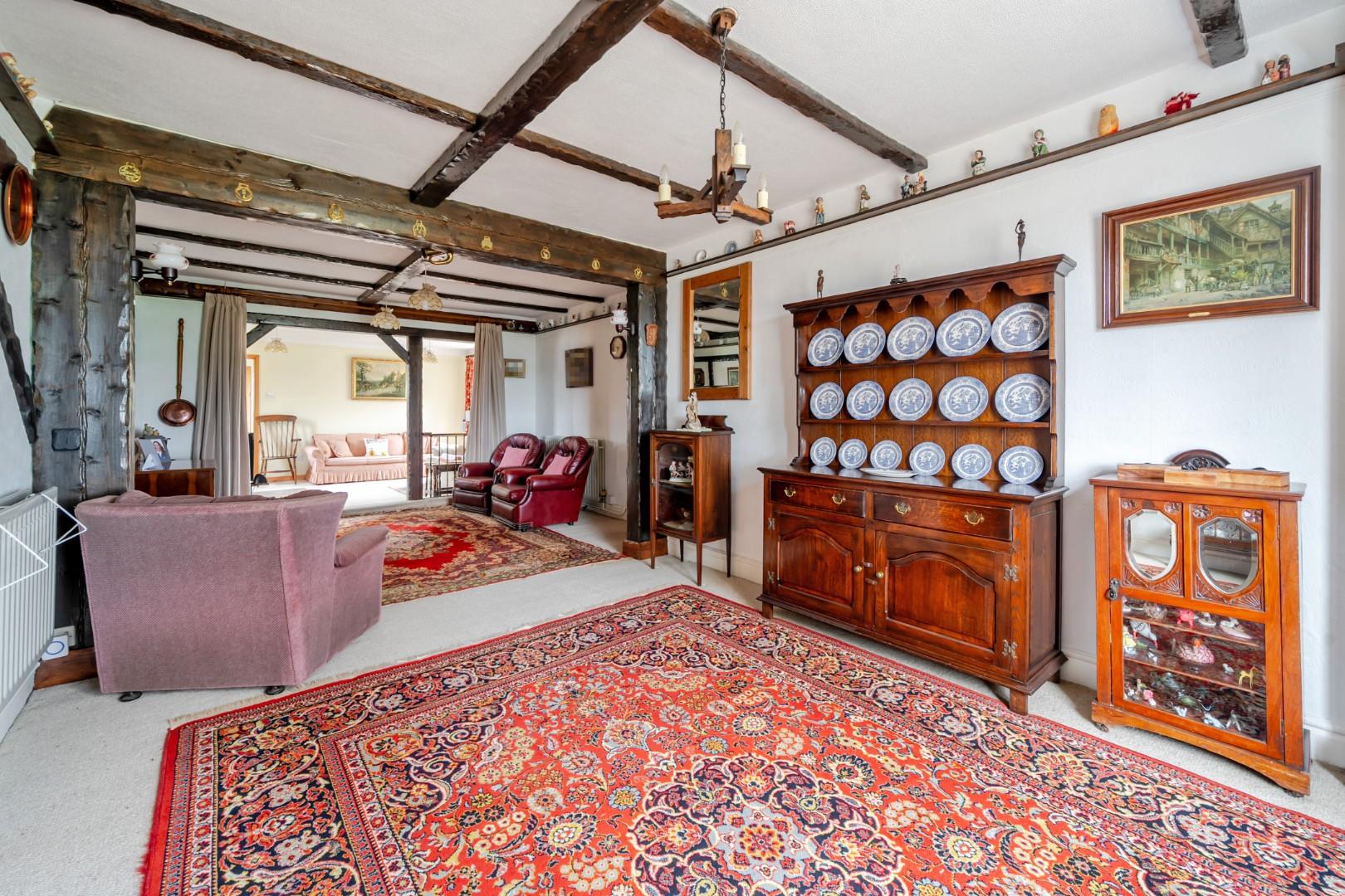 Double glazed leaded light style window to front, two radiators, ‘Country Style’ feature fireplace with tiled hearth, feature beamwork to walls and ceiling, timber latch style door to inner hallway and through access to sitting room.
