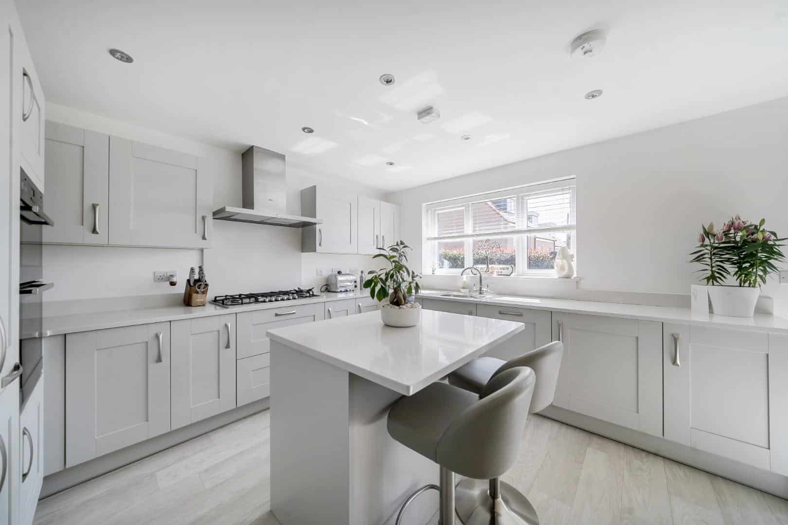 As well as being beautifully presented, the home offers nearly 1900 sq ft of accommodation not including the double garage. Downstairs you have a 23′ sitting room, office, reception room, fully fitted kitchen, utility room and a gym. Upstairs you are greeted by a large galleried landing. There are oak doors to all bedrooms and family bathroom. The main bedroom is 18′ and has a “Juliet” balcony as well as an en suite. Bedroom two is 16′ and the other two bedrooms are also good well proportioned doubles. The bathroom has been refitted and has dual washbasins and an “over deep” bath.