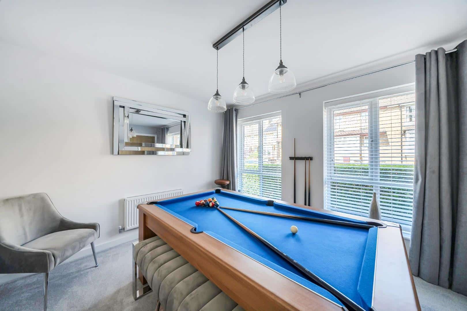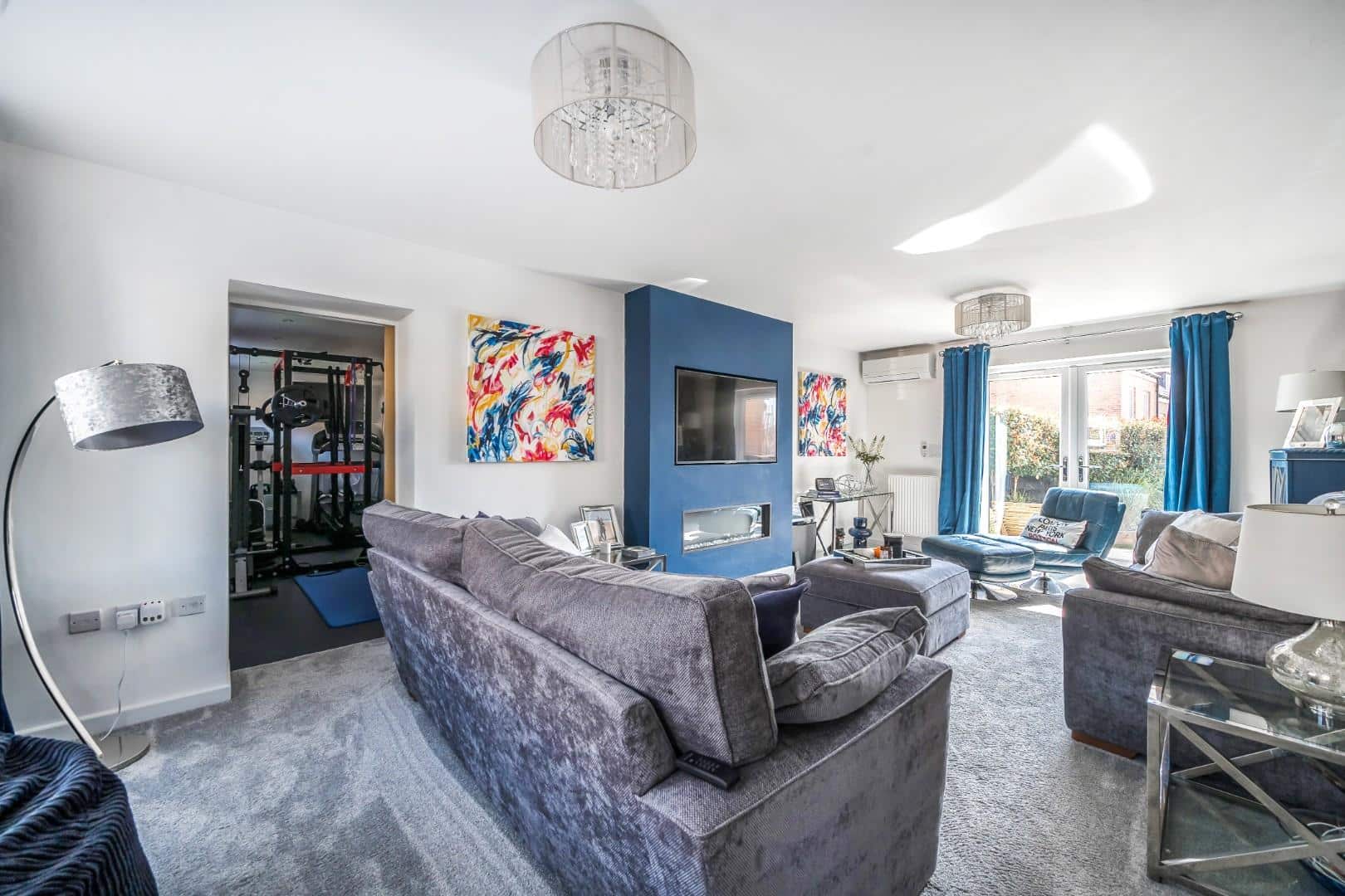 Two double glazed windows to front aspect. Double glazed “French” doors leading to rear garden. Two radiators. Media wall with flush fireplace with glass front below. “Oak” door to gym. Wall mounted air-conditioning unit.
