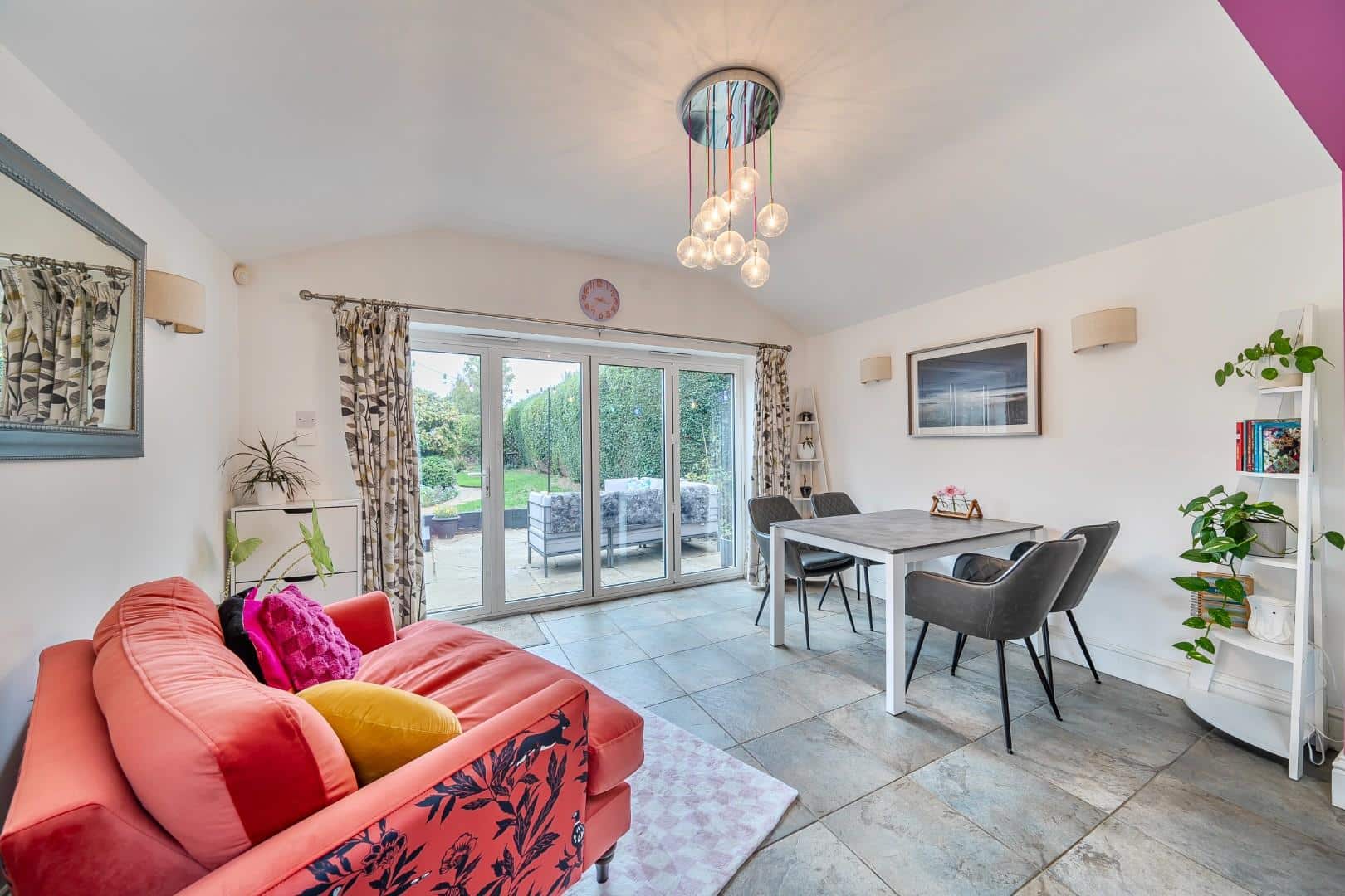 Double glazed Bi-fold doors to rear aspect. Tiled flooring with underfloor heating. Vaulted ceiling. Three wall light points.