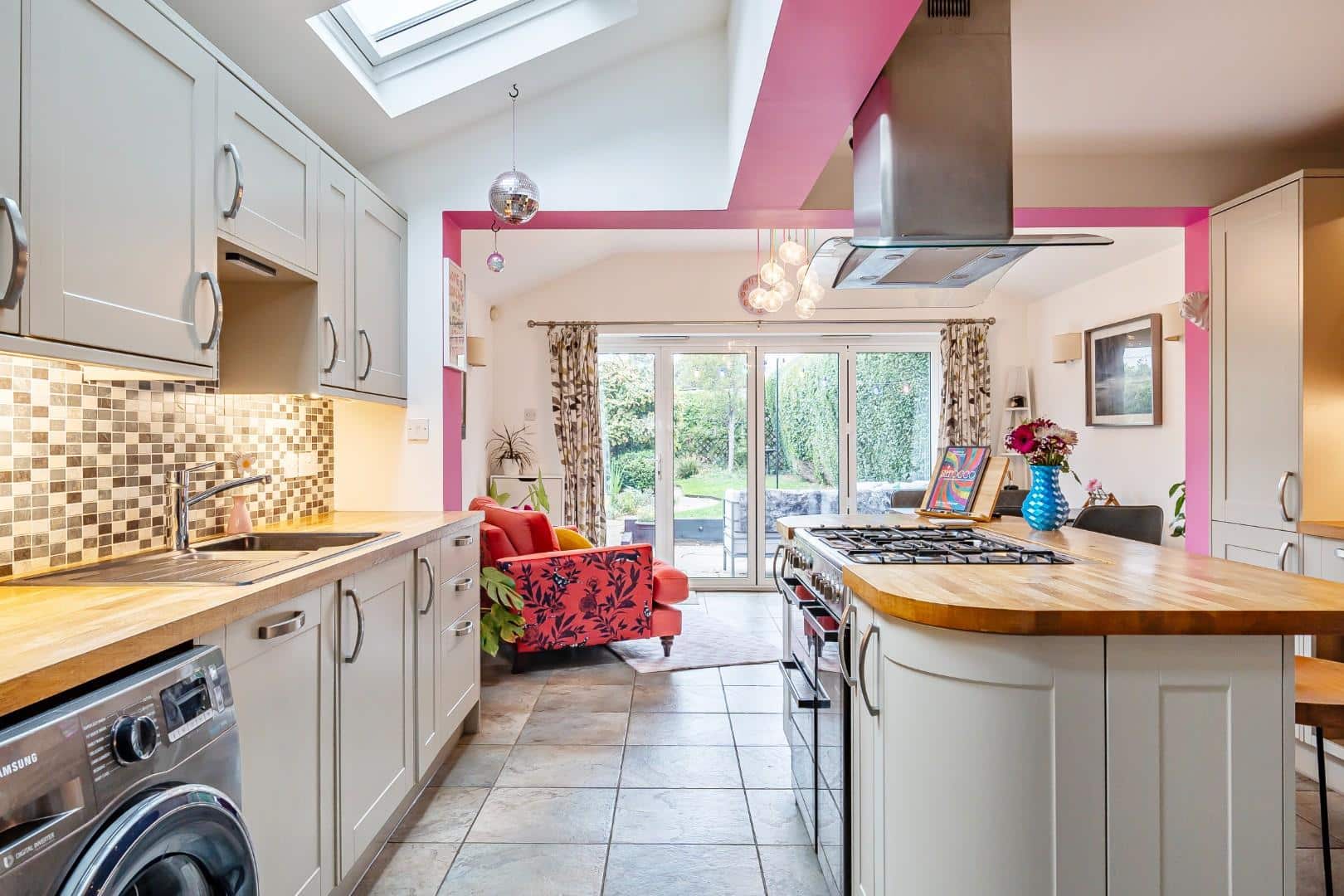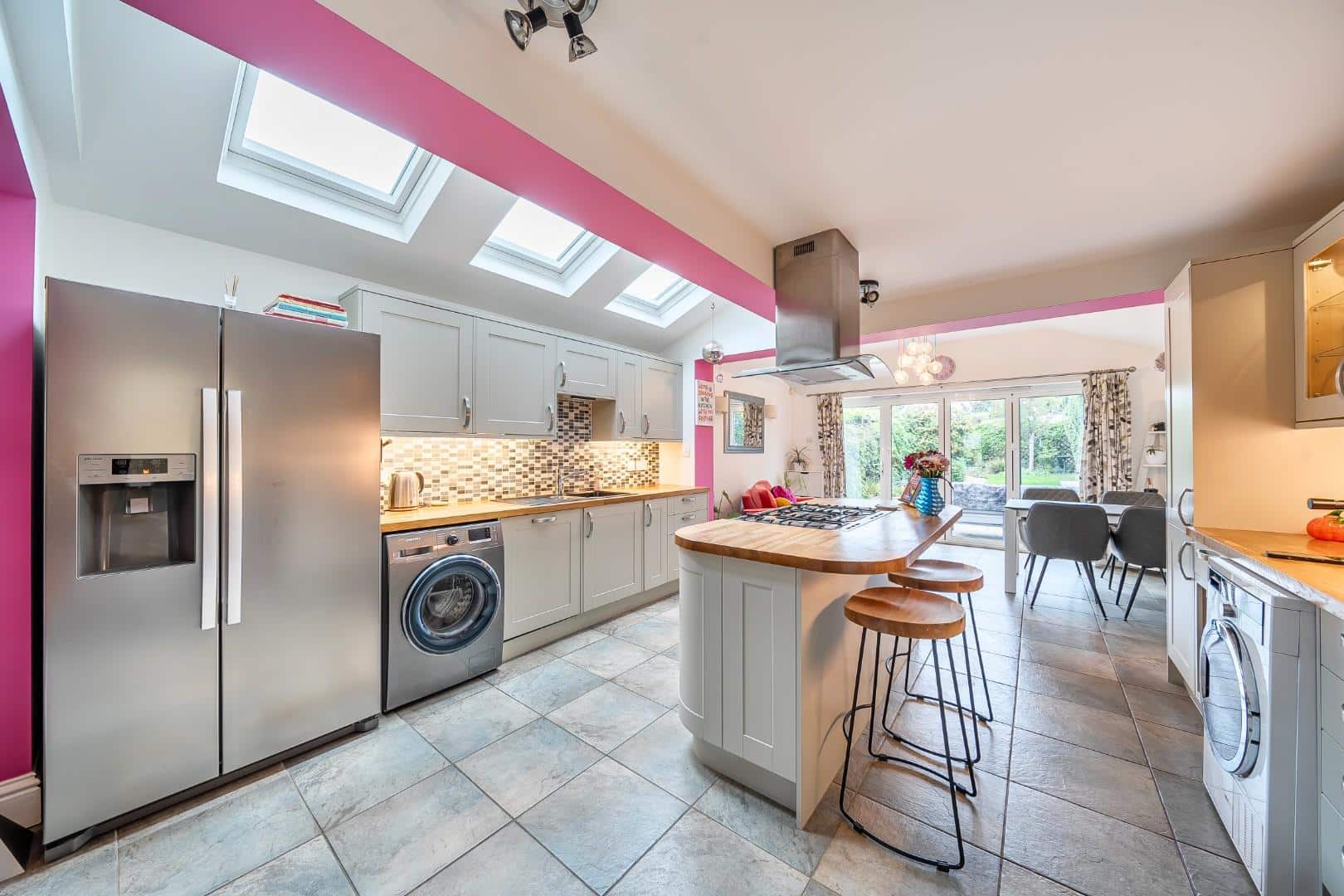 Three double glazed Velux windows to vaulted ceiling. Exposed timber flooring. Range of Shaker style base and eye level units with solid wood worktops over. Central island with wooden worktop and housing range style cooker with 5 ring gas hob and double oven with stainless steel hanging extractor hood over. American style fridge freezer with water and ice dispenser. Integrated dishwasher. Tiled flooring with underfloor heating. Pluming for washing machine. Inset sink drainer with mixer taps over. Opening to family room.