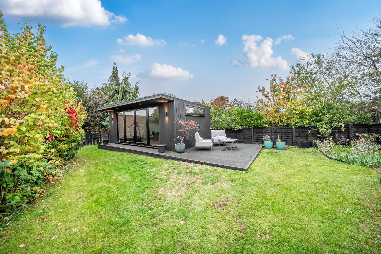 Private West facing rear garden laid to lawn and enclosed by fencing and hedge borders. Composite decked area attached to the composite office. Bi-Fold doors to office.