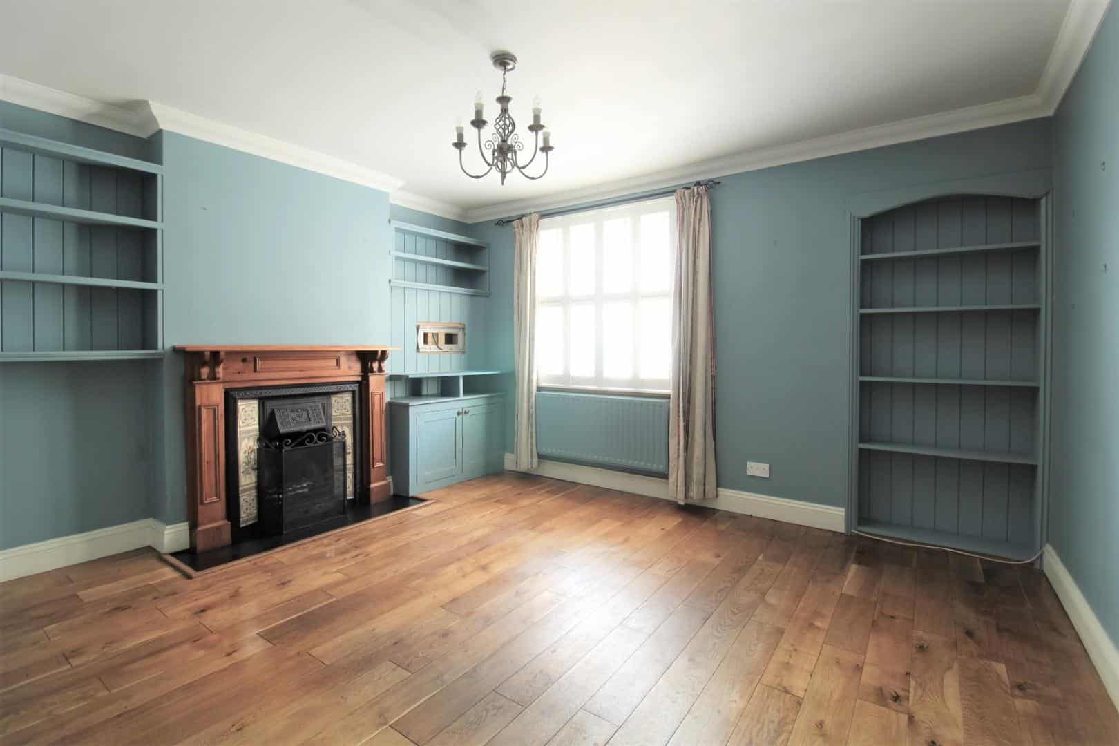 Double glazed window to front aspect complete with UPVC shutters. Solid wood flooring. Cast iron open fireplace with ornate tile surround and wooden mantle over. Radiator. Cupboard to side of fireplace housing electric meter. Recessed shelving to the other side of the fireplace.