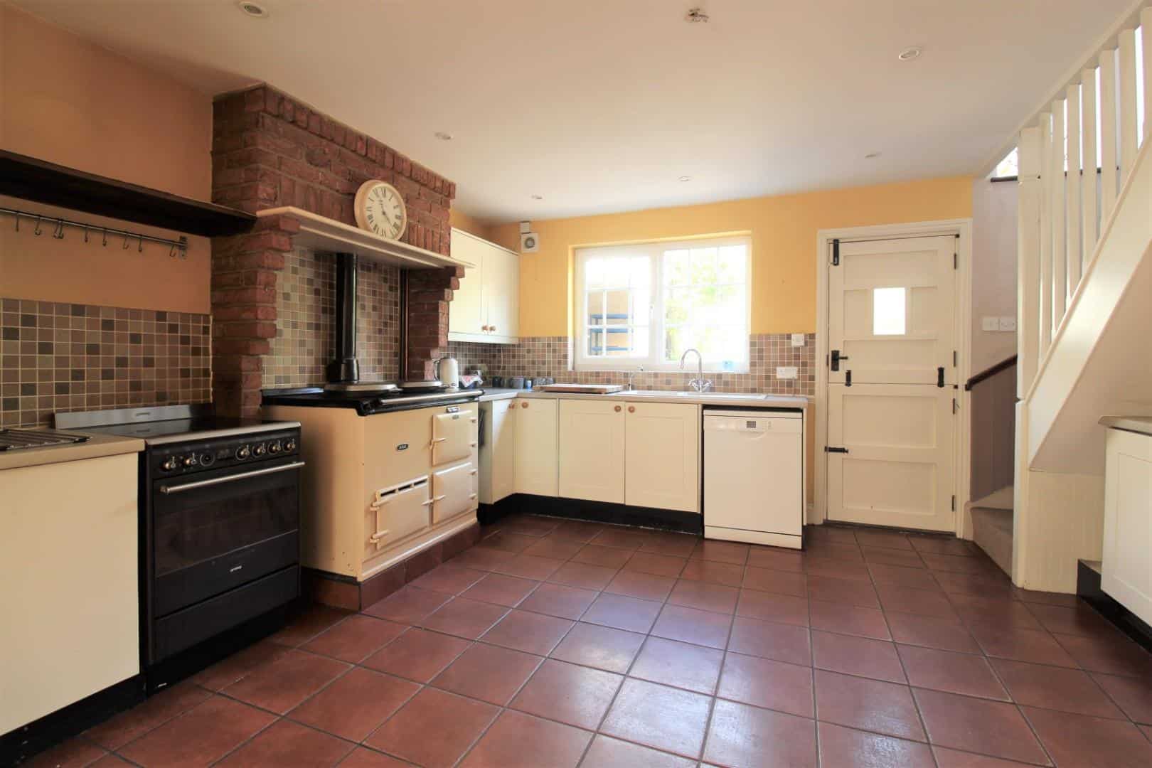 Double glazed window to rear aspect. A barn style rear door leading to garden. Recessed brick area housing a Gas burning “AGA” complete with separate ovens and hot plates. Range of base and eye level units with worktops over. A one and a half sink drainer with swan neck mixer tap over. Dishwasher. Washing machine and a SMEG fridge/freezer. Tiled flooring throughout. Door to lounge. Opening to utility room. Recess spotlights to ceiling. Stairs to first floor accommodation. Under stair recess.