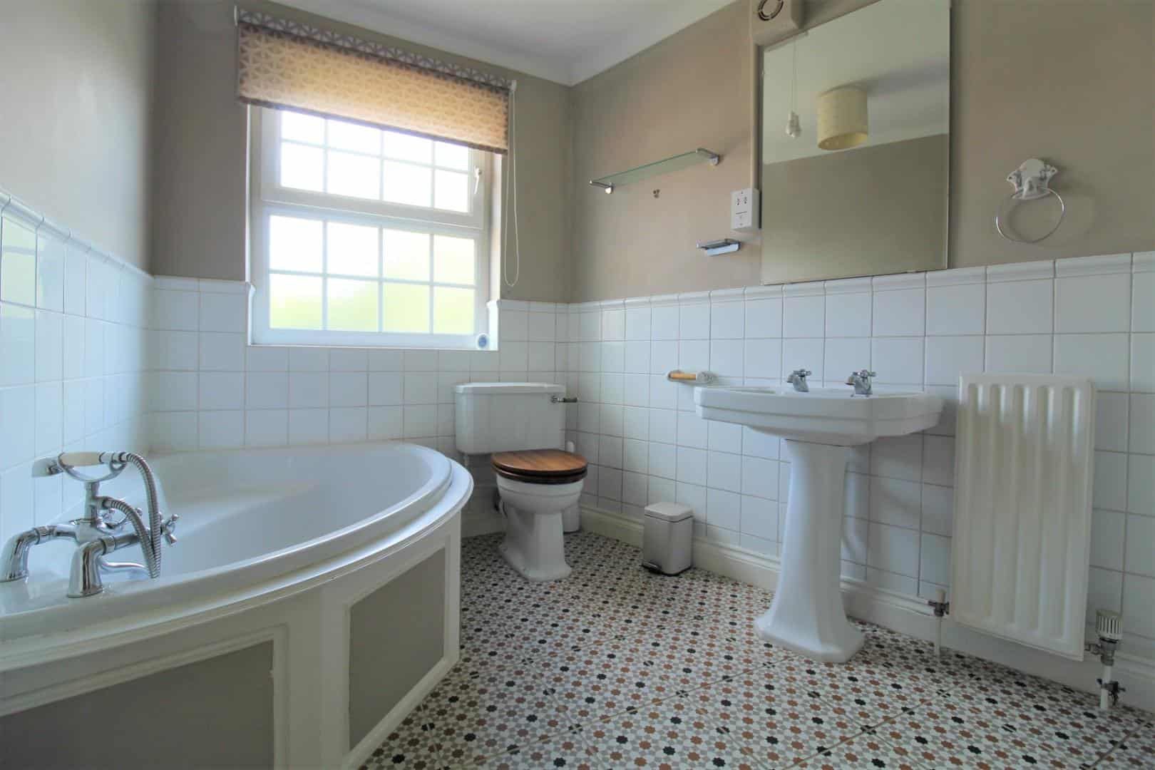 Double glazed window to rear aspect. A larger than average four piece bathroom suite comprising of a corner bath with telephone style mixer taps, pedestal wash basin, low level wc and flush and a enclosed walk in shower. Radiator. Electric shaver point. Extractor fan.