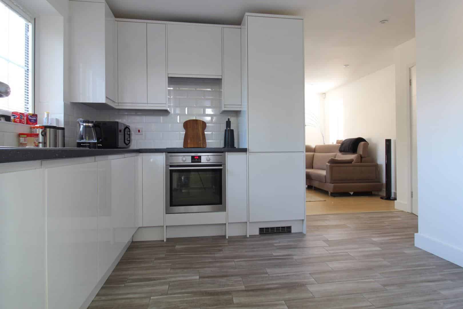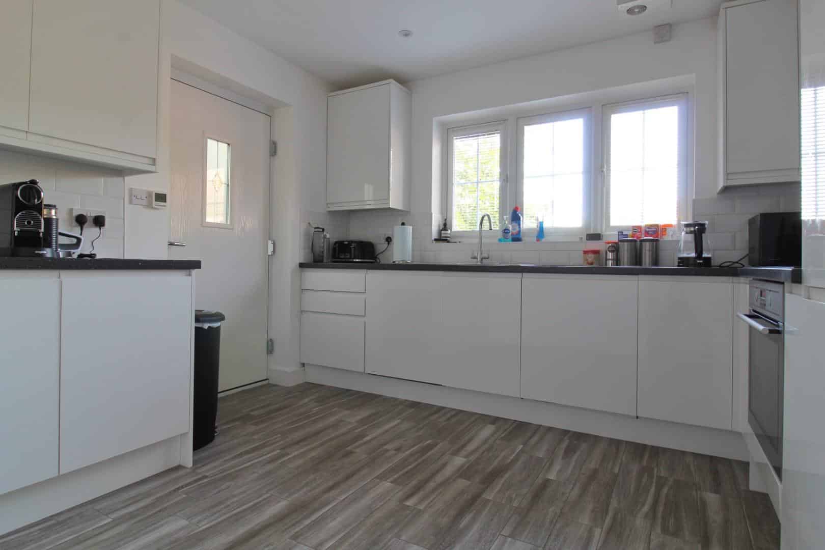 Fitted with an extensive range of white high gloss high and base level units with contrasting work surfaces and tiled splash backs over, stainless steel sink and drainer unit with mixer tap over, built in ‘AEG’ electric oven and hob with integrated extractor over, integrated ‘Miele’ dishwasher and ‘Zanussi’ washing machine, integrated fridge/ freezer, double glazed window to rear and double glazed composite style door to side, tiling to floor with under floor heating, through access to lounge.
