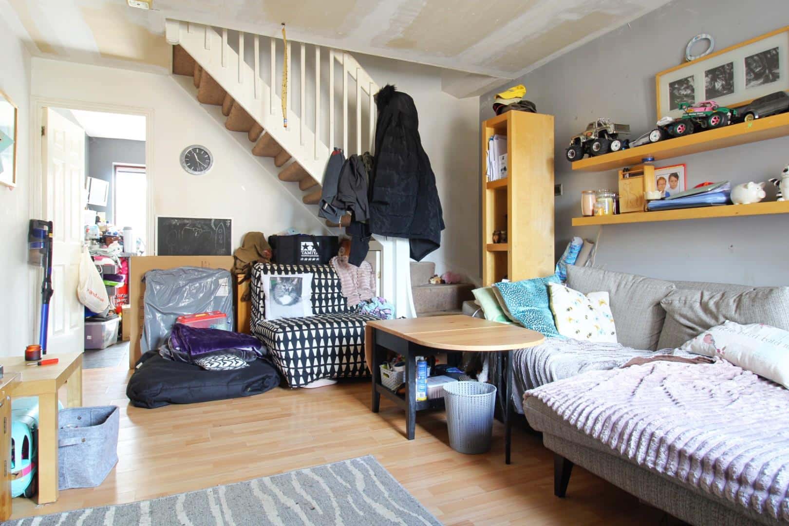 Double glazed window to front, twin panel radiator, stairs rising to first floor landing with spindled balustrade and recess and cupboard under, laminate flooring and white panel door to kitchen/ dining room.