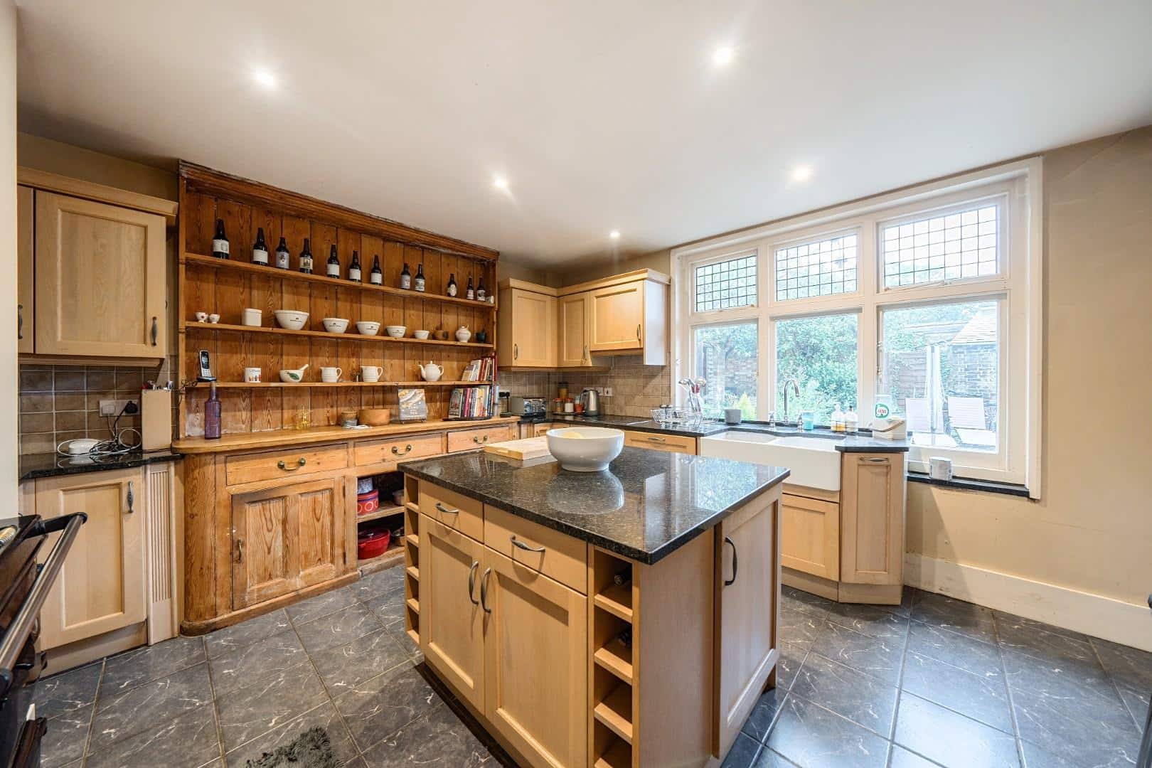 Original “Victorian” window to rear aspect. Second staircase to first floor. Re-fitted kitchen that features around an original fitted solid “Oak” dresser. There are a range of base and eye level units with with a centre island with storage under and “Quartz” worktops. Integrated dishwasher. Both integrated fridge and freezer. Fitted “Villeroy and Boch” double butler sink with mixer taps. Gas “Rayburn” range cooker which heats the water and central heating as well as having a double oven and plate warmer and two hob rings above. Tiled flooring. cess spotlights.
