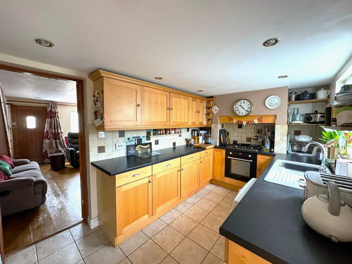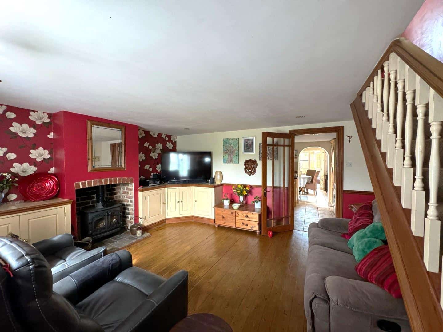 Double glazed window to front aspect. Radiator. Stairs to first floor. Door to kitchen. Open brick fireplace with brick hearth and housing Cast Iron log burner. Bespoke storage cupboards either side of the fireplace. Exposed timber floorboards. Recess spotlights.