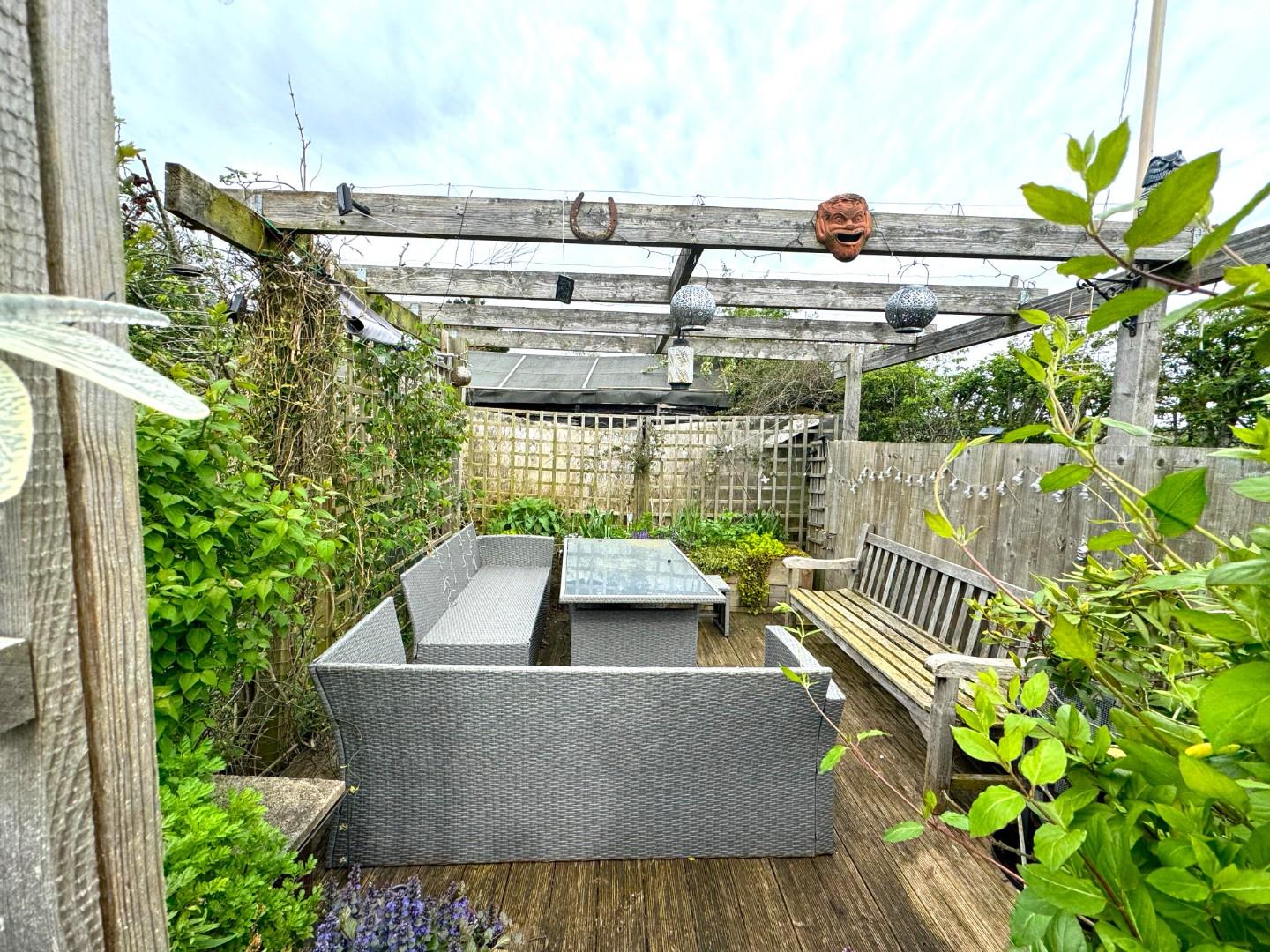 A beautiful rear garden that is a great size and split into three distinct parts. There is a courtyard area just outside of the conservatory and dining room. Outside tap. This in turn has steps up to a second part of the garden that has a double gate that allows for parking for two vehicles. There is also a timber shed, summer house and a greenhouse. This area is laid to shingle. There is then a gate that leads to the main area f the garden that is mainly laid to lawn. There is a decking area that is perfect for entertaining with a pergola over. There is an abundance of plants and flowers and the garden has field to both the rear and front making it incredibly private.