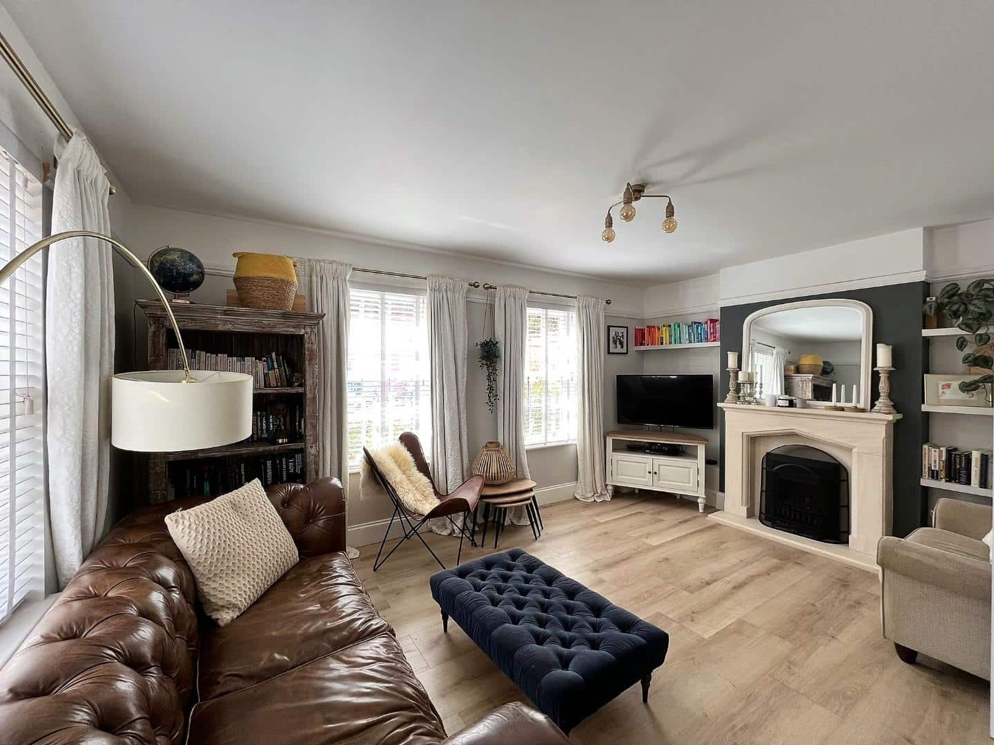 Dual aspect lounge with two double glazed sash windows to side aspect and double glazed sash window to front aspect. Gas fireplace with stone hearth and surround. Wood effect flooring.