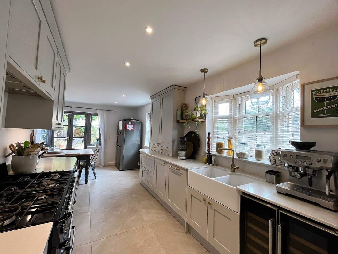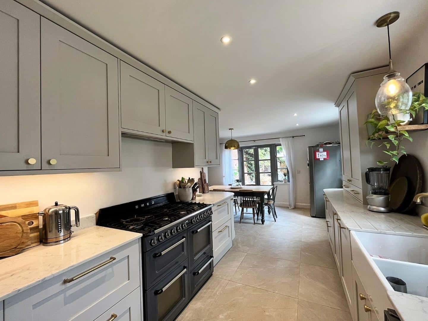 Double glazed “French doors” to side aspect that lead to rear garden. Two double glazed sash windows to front aspect. Two further double glazed windows to side aspect. Door to utility/wc. Extensive range of refitted kitchen base and eye level units with work tops over and two corner end units. There is a double butler sink complete with mixer taps. There is a seven ring “SMEG” range cooker complete with two ovens and a plate warmer and grill with extractor hood over. Intergrated dishwasher. Freestanding LG American style fridge freezer complete with ice maker. Radiator. Tiled flooring. Recess spotlights.