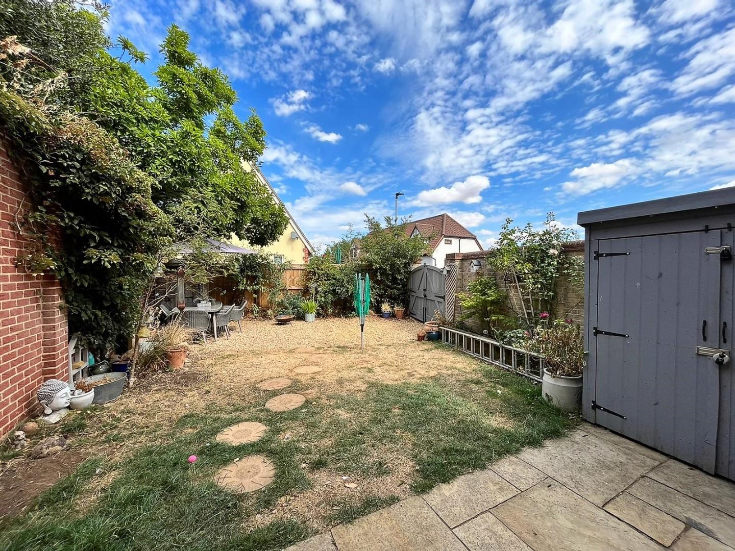 Private and attractive rear garden enclosed by a combination of brick walling and fencing. There is a patio area that extends to a lawned area with a variety of flower and shrub borders. To the rear of the garden is a shingle driveway which has double gated entrance from The Maltings. Outside tap. Shed.