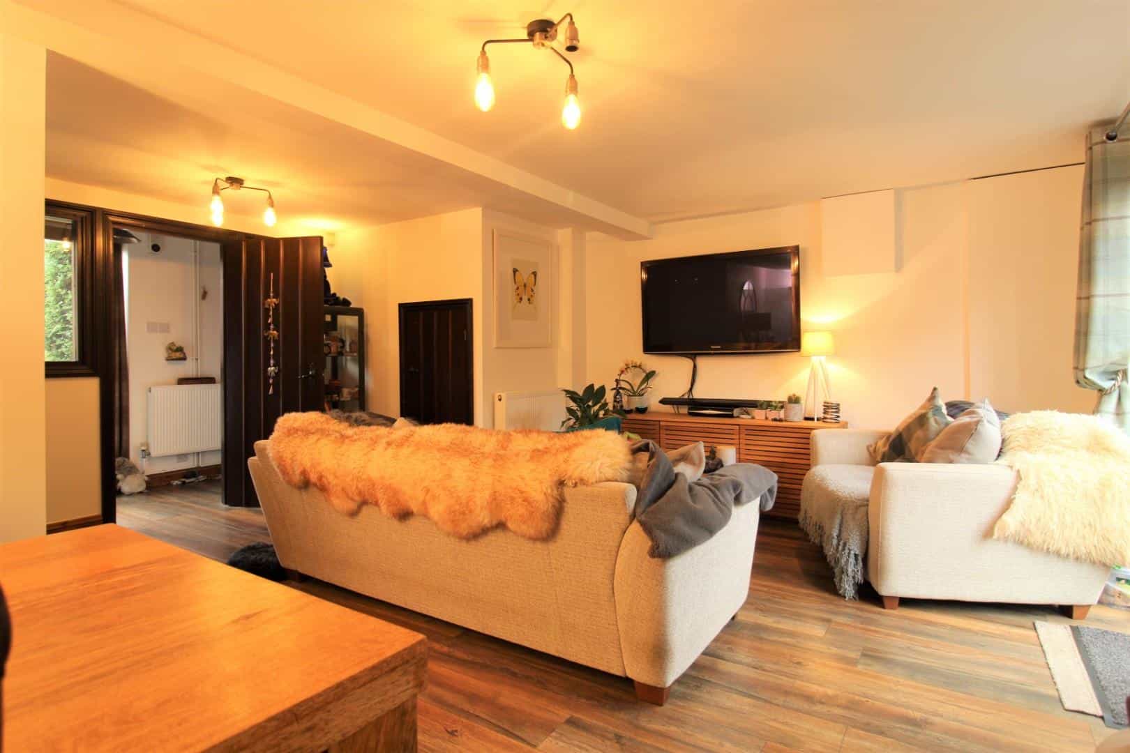 A spacious ‘L’ shaped room measuring 19’7 max x 17’4 max and offering sealed unit double glazed French doors which open out to the rear garden (with matching side panels), two radiators, wood finish flooring, door to understairs cupboard and through access to the kitchen.