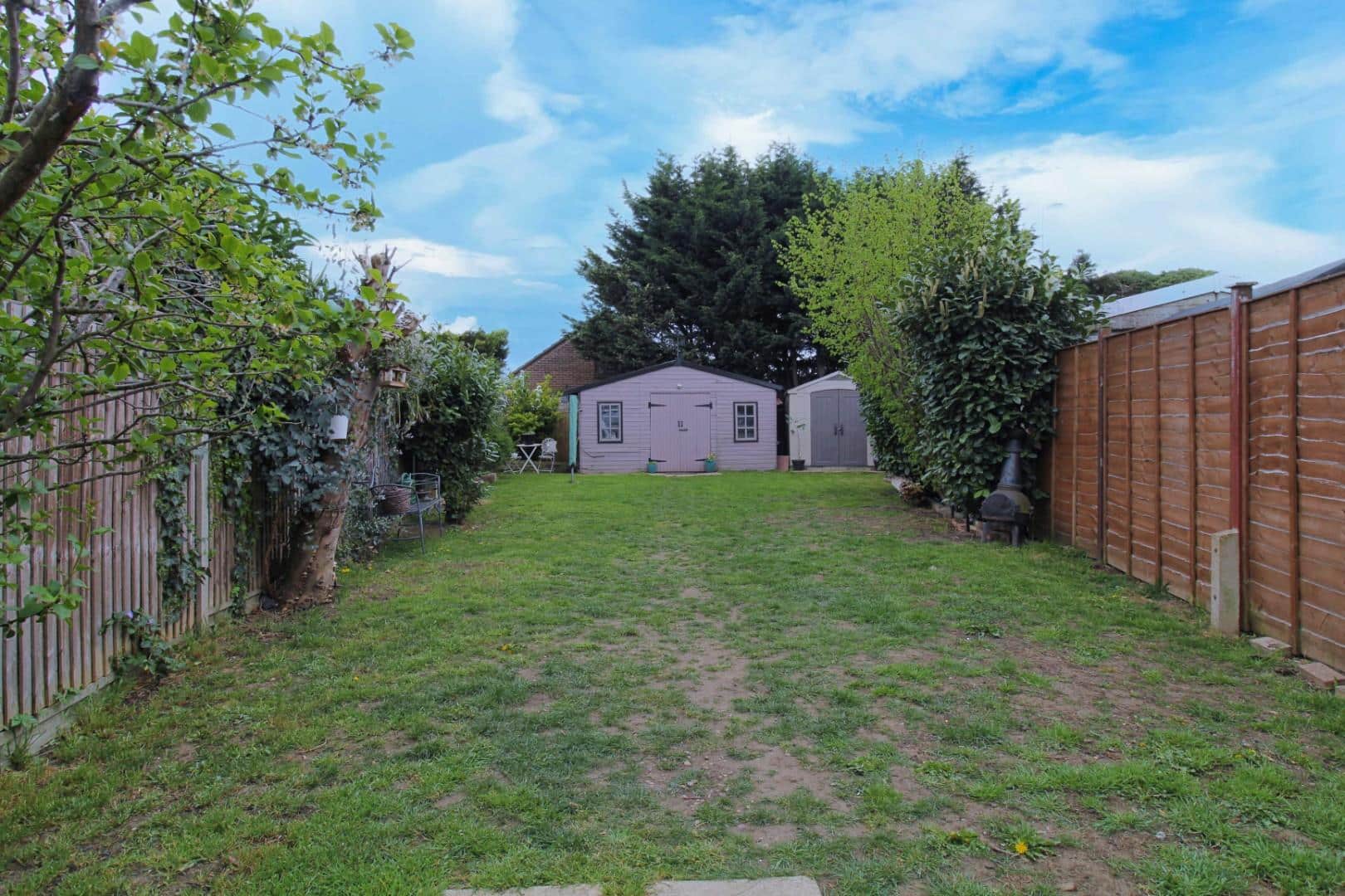 Measuring approximately 70′ in length (excluding the patio area) and laid to lawn, enclosed by timber panel fencing and with a sand stone patio (enclosed with a timber picket fence) access to timber outbuilding/ workshop and separate garden shed.