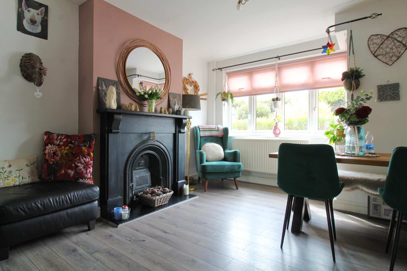 Double glazed walk in bay window to front, radiator, period feature fireplace, wood finish flooring and picture rail.