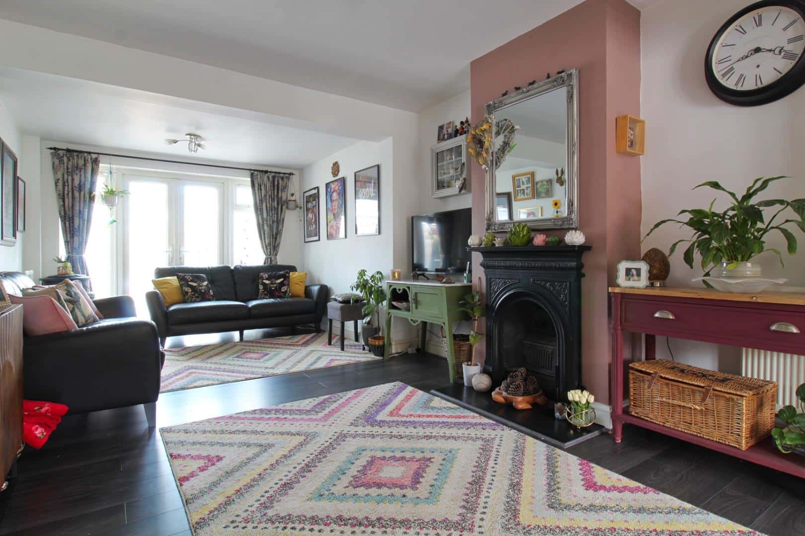 Double glazed French doors (with matching side panels) to conservatory, open fire set into period fireplace with tiled hearth, wood finish flooring and radiator.