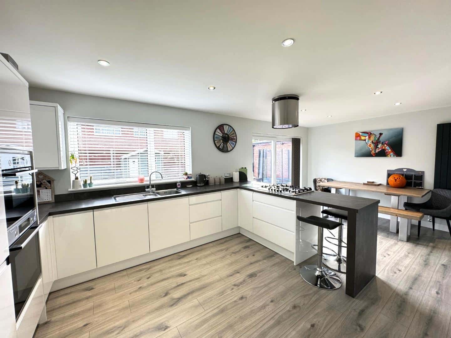 Double glazed window to side aspect. Double glazed patio doors to side aspect. Radiator. Beautiful refitted kitchen comprising of a range of “High Gloss” units with soft close drawers and cupboards and contrasting worktops over. Five ring gas hob with hanging stainless steel cooker hood over. Built “Bosch” in Double oven with microwave. Intergrated tall fridge/freezer. Intergrated dishwasher. Inset sink drainer with mixer taps. Wood effect flooring. Recess spotlights. Door to utility room.