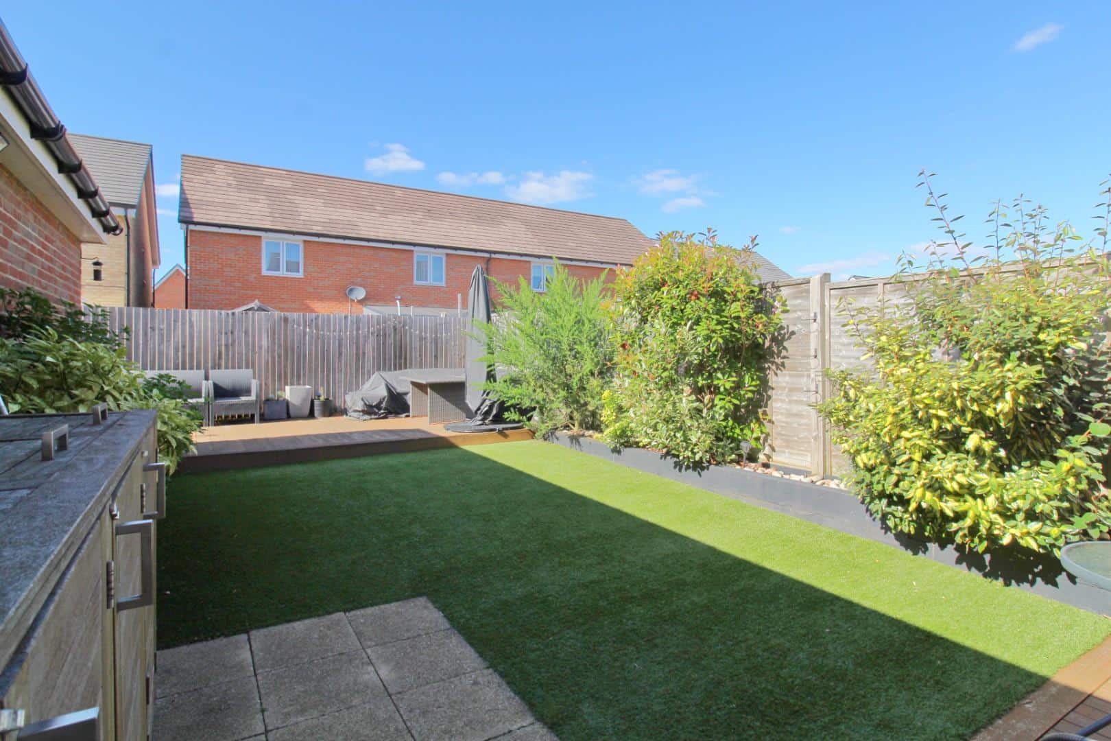 Enclosed by timber panel fencing and laid to an artificial lawn with a paved patio and timber deck and an additional raised timber decking area to the rear of the garden and extending to the rear of the garage providing a perfect seating/ entertaining area. There are various raised timber borders, French doors to the office room and gated access to the side leading to the driveway and garage.