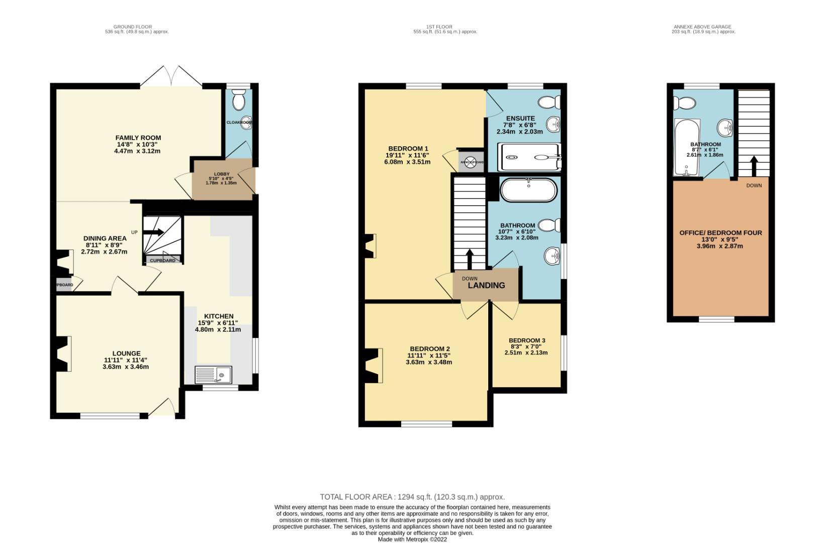 Having been substantially extended by the current owners, this wonderful home now offers three separate reception areas, a huge master bedroom with separate en suite shower room, two further bedrooms and a re-fitted family bathroom in the main house and then a further bedroom/ potential office with en suite bathroom in the annexe above the garage.