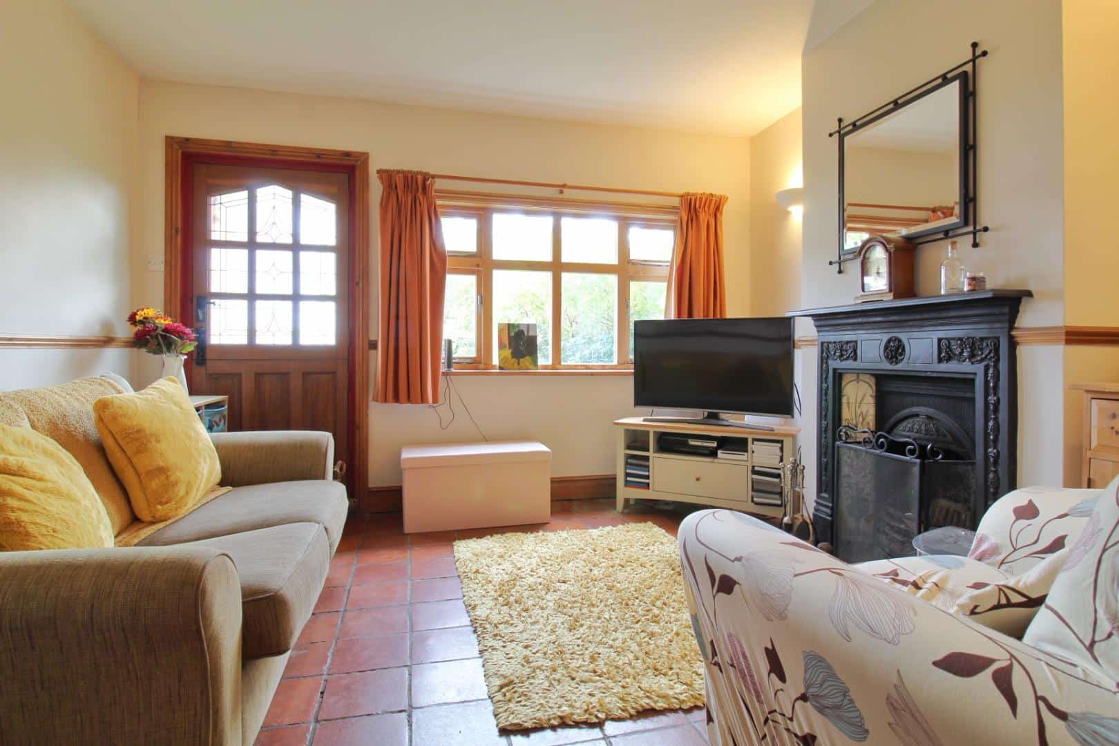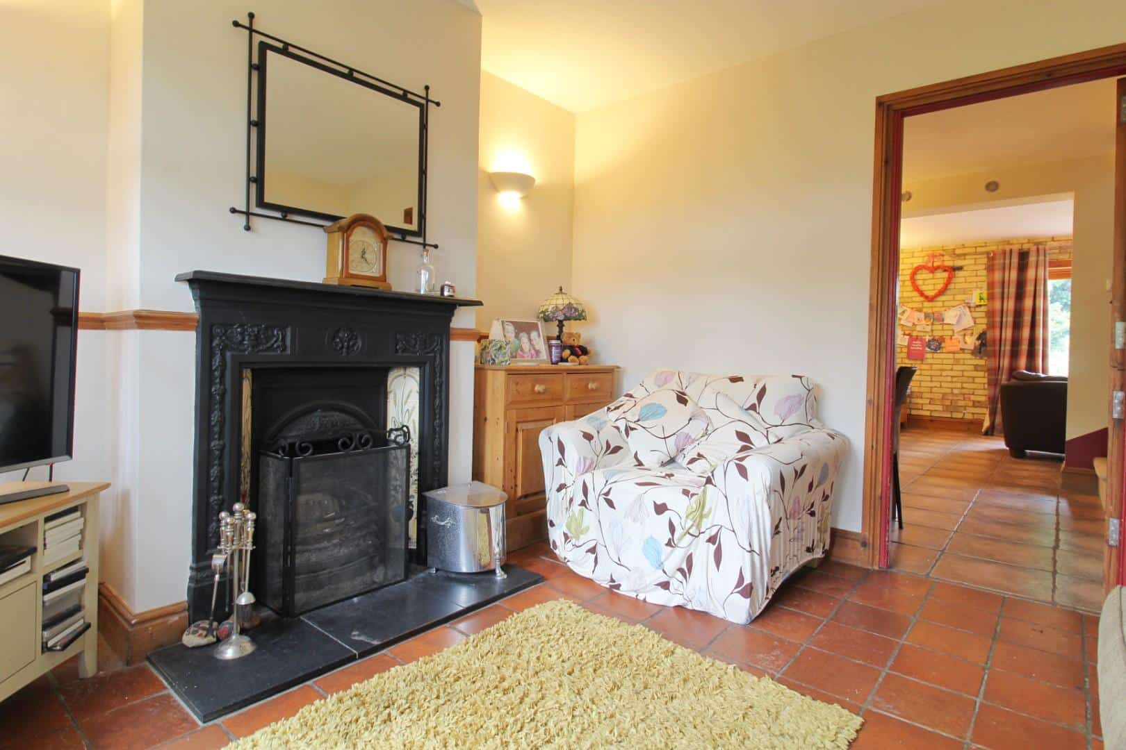 Sealed unit double glazed window to front, open fire set into period surround with tiled inserts and hearth, quarry tiling to floor, two wall light points and dado rail.