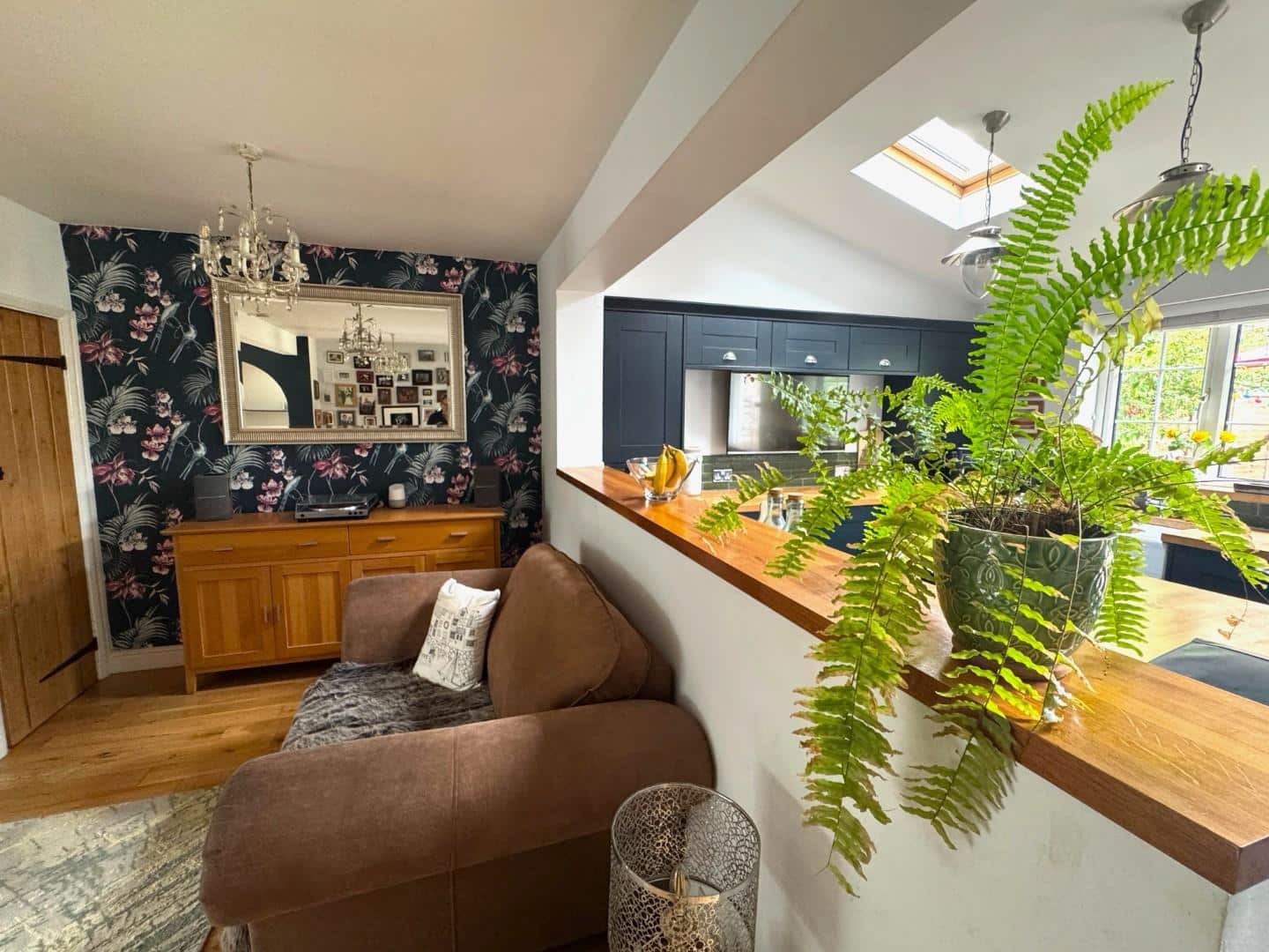 Double glazed window to rear aspect. Double glazed French doors to rear aspect and leading to garden. Two Velux windows to vaulted ceiling. Tiled flooring with underfloor heating. Extensive range of navy blue base and eye level units with solid timber worktops over. Inset Butler sink with mixer taps. Range style cooker with five ring gas hob and double oven. Integrated dishwasher. Integrated washing machine.