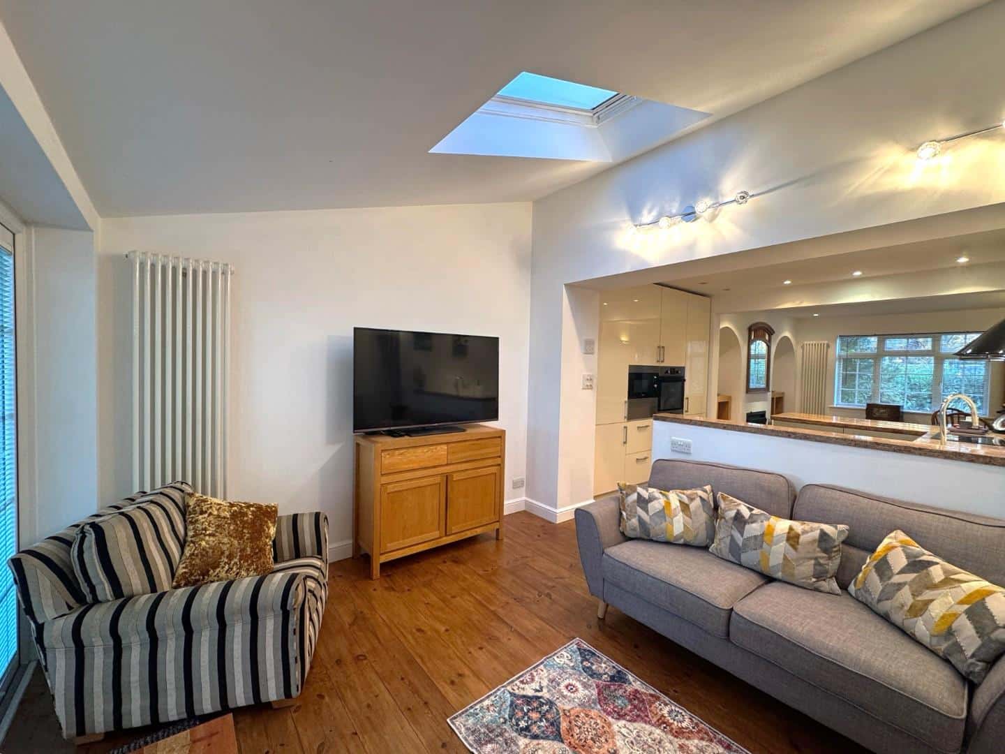 Double glazed french doors to rear garden. Two picture windows to rear aspect. Opening Velux window. Two vertically mounted radiators. Concealed entrance to lift which provides access to bedroom one. Solid wood flooring. Wall-mounted decorative spotlights.