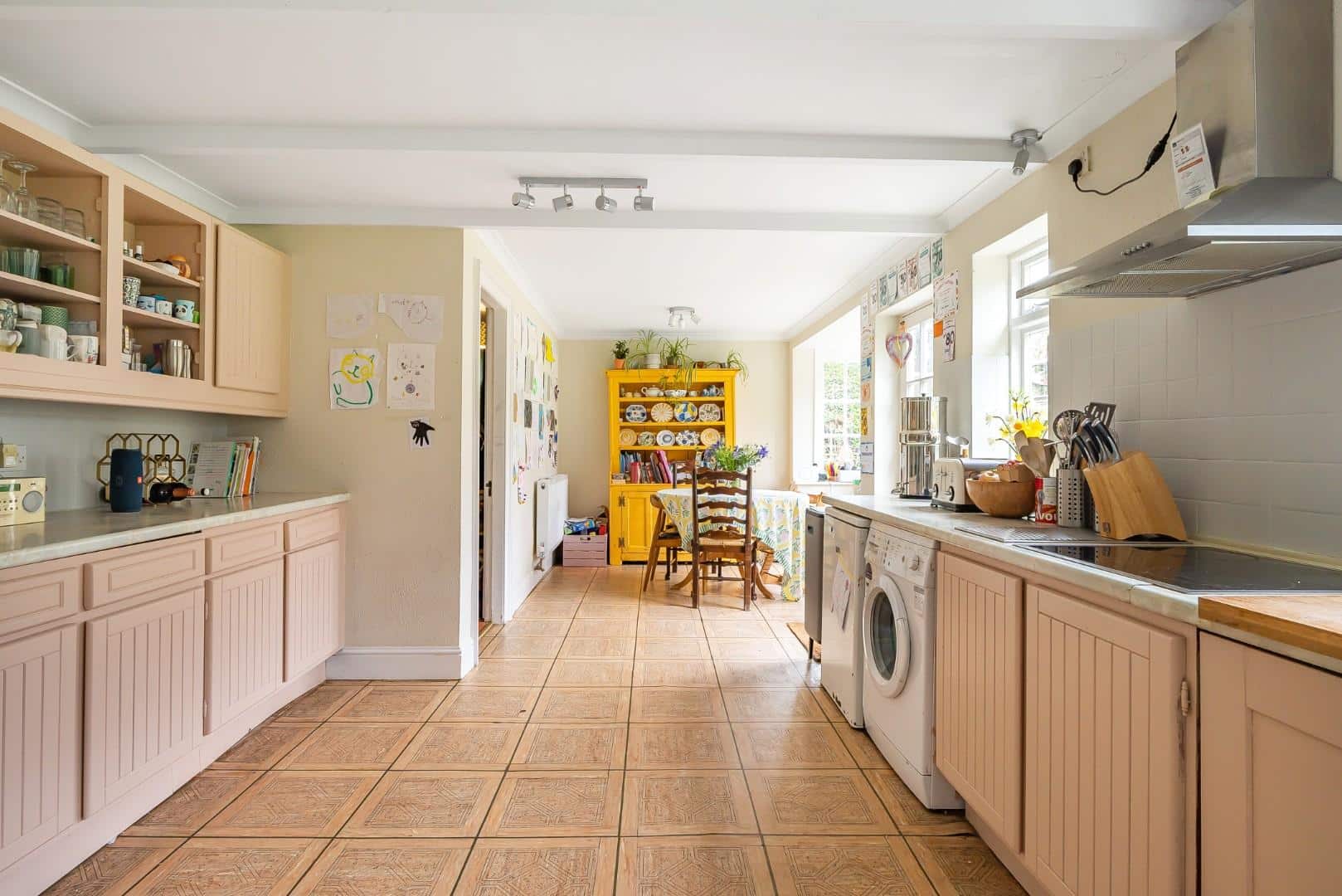 Inset sink drainer. Plumbing for washing machine. Space for dryer. Tiled flooring. Radiator.
