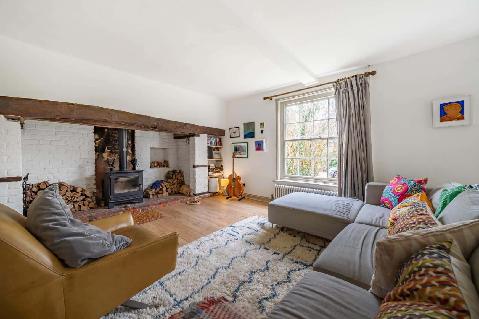 Two sliding sash windows to front aspect. Two ornate refitted radiators. Picture rail. Dado rail. Large open inglenook fireplace housing “Cast iron” log burner with ‘Bressumer’ over. Solid wood flooring. Internal doorway to inner hallway.