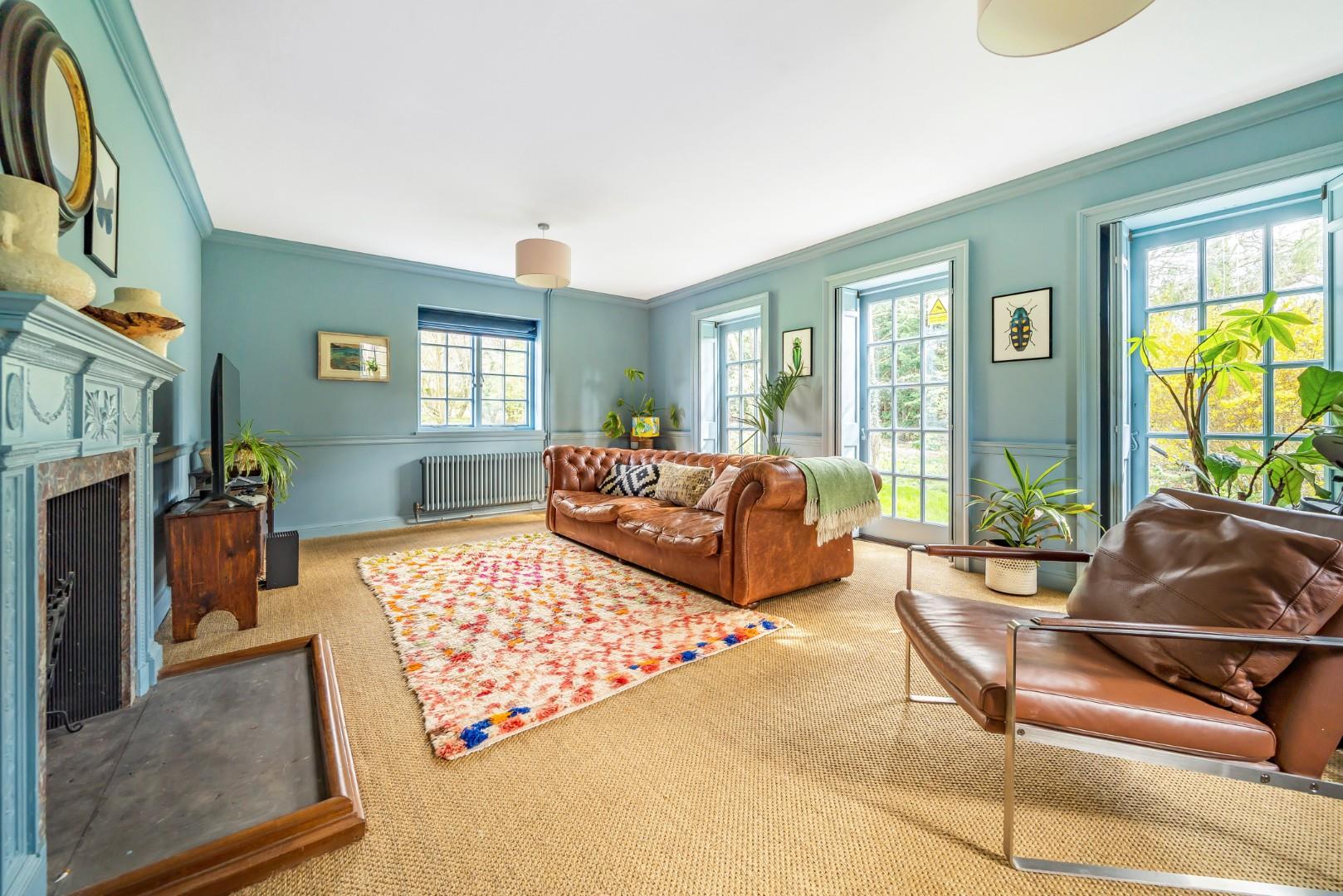 A triple aspect room with three multi – panel glazed doors to side aspect that lead to the garden. Windows to both front and rear aspects. Two re-fitted radiators. Wonderful open fireplace with slate hearth and wooden surround. Dado rail. Coving to ceiling.