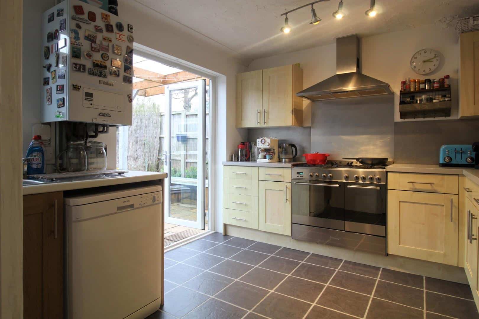Double glazed window to rear aspect. Half glazed door to rear aspect. A refitted kitchen comprising of built in double width oven with gas hob over and stainless steel extractor hood over. Wall mounted gas boiler. Tiled flooring throughout. Recessed spotlights. Stainless steel sink drainer. Range of base units with worktops over and wall units above.