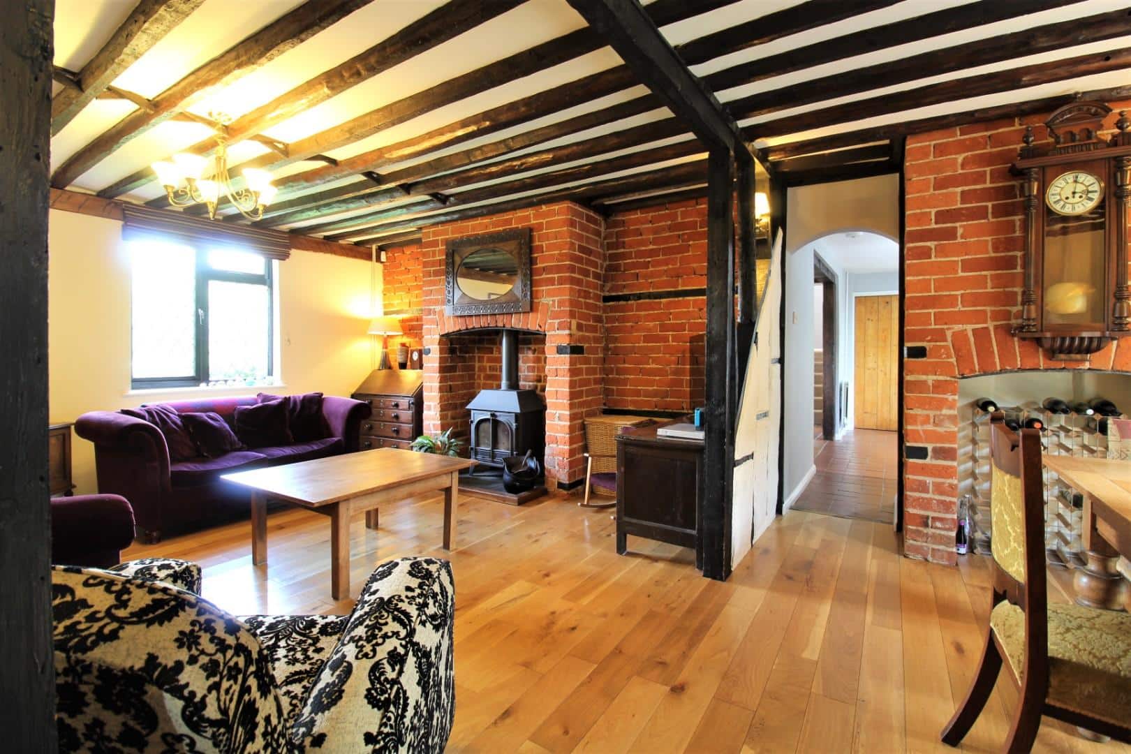 Double glazed leaded light window to front aspect. Radiator. Log burner housed in a brick exposed inglenook with brick plinth above. Recess to either side of the chimney breast with exposed brickwork. Exposed wooden flooring throughout. Beams to both ceiling and walls.