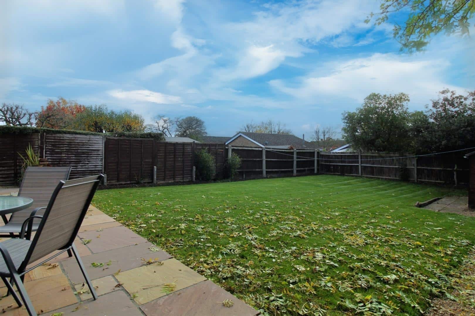 An extremely private and established rear garden offering an extensive lawn area with hardstanding for a garden shed and step up to an impressive sandstone patio (with integrated lighting) offering a large entertaining space and extending to both sides of the bungalow with a courtesy door leading to the garage and gated access to the front, outside tap and external power point, modern security lighting to all four elevations.