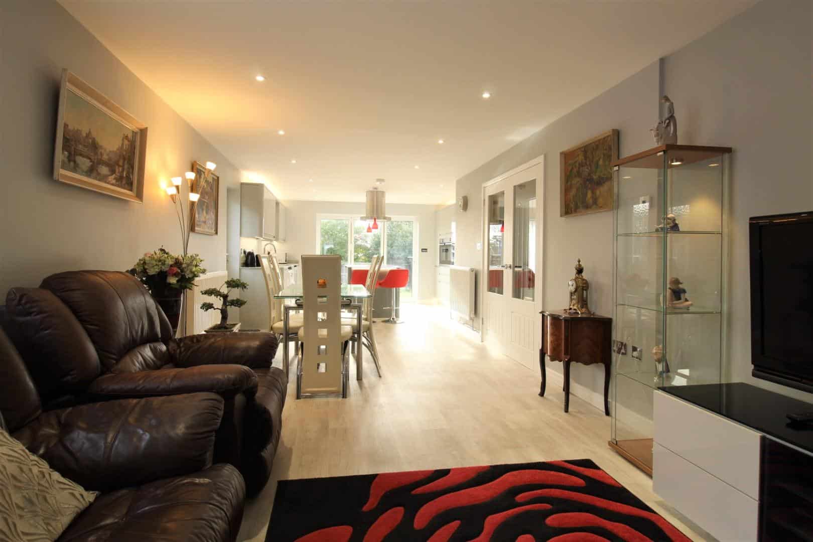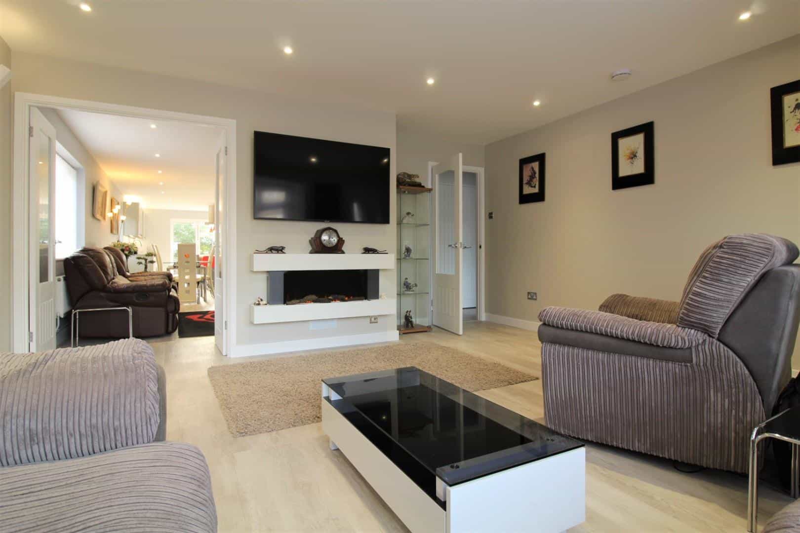 Large walk in bay window to the front, vertical radiator, contemporary LED flame effect feature fireplace, inset LED Spotlights to ceiling, two LED wall lights and an LED picture light, wood finish flooring (extending through to the inner hallway and open plan kitchen/ family room), contemporary etched glass French doors to the open plan kitchen/ family room and an etched glass door to the inner hallway.