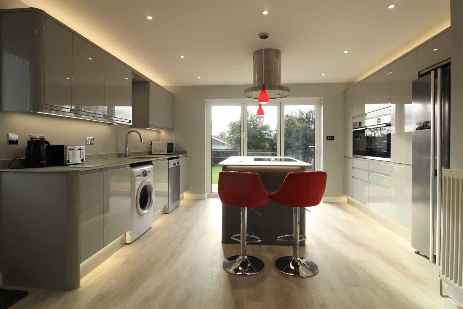 A truly STUNNING space with the kitchen area fitted with an extensive range of high gloss high and base level units (featuring LED high and low level lighting) with solid laminate work surfaces and splash back over and incorporating a one and a half bowl sink unit with sensor controlled mixer tap over (with extendable nozzle), two built in ‘Neff’ ovens (at eye level) and a ‘Neff’ induction hob (set into the island unit) with contemporary extractor unit over, spaces for washing machine, dishwasher and American style fridge/ freezer, ‘pop up’ socket/ USB tower and bi-folding doors opening out to the rear garden, double glazed door to side and double glazed window to side, two radiators, inset LED spotlights to ceiling and wood finish flooring, etched glass French doors to inner hallway.