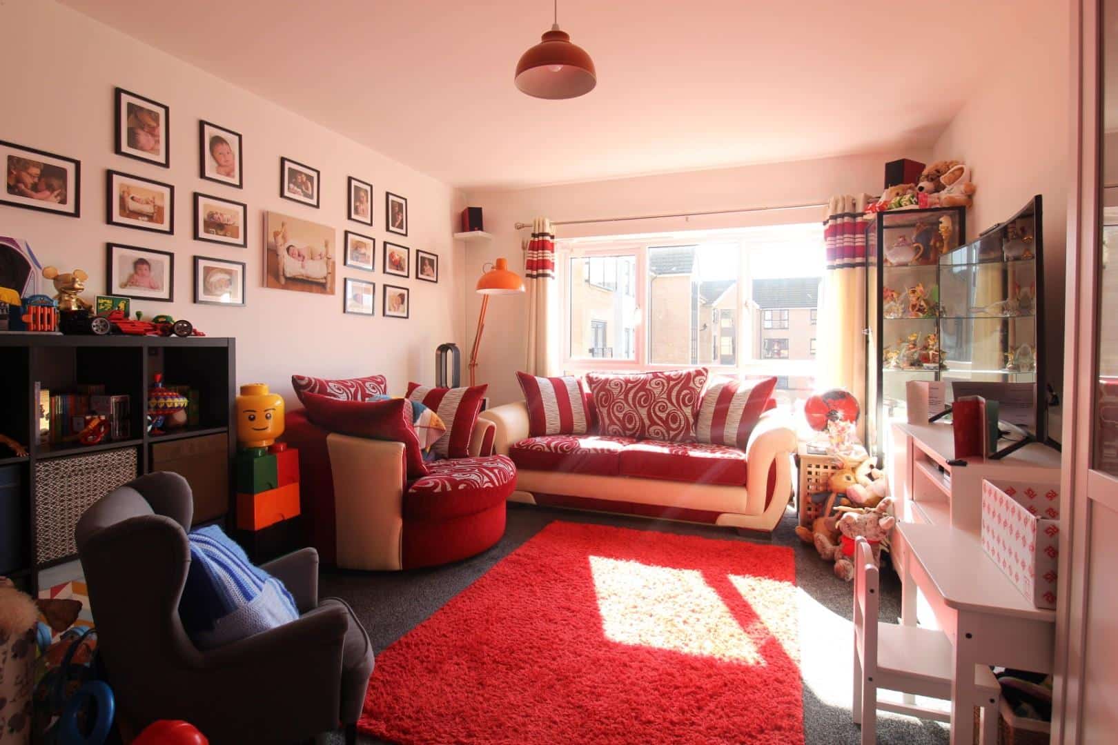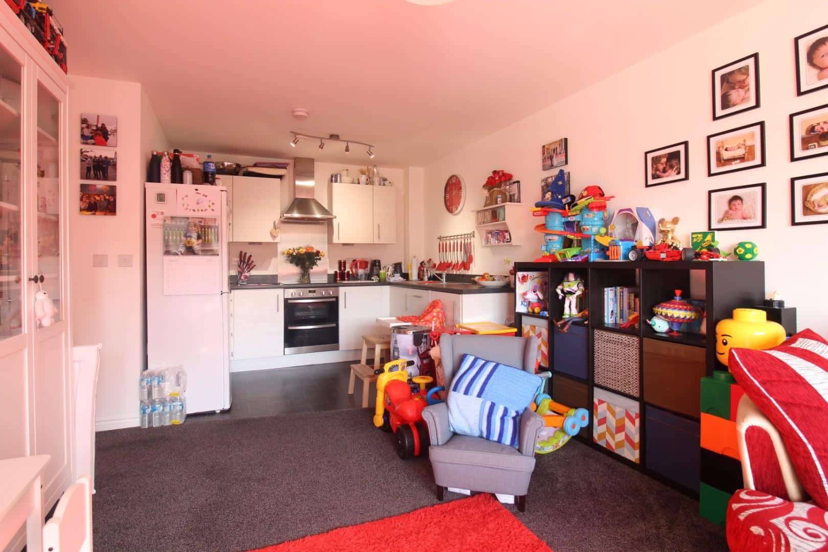 A light and spacious open plan room with a large double glazed picture window overlooking the front elevation and offering a kitchen area with a modern range of white high and base level units with contrasting work surfaces and splash back over and incorporating a one and a half bowl sink and drainer unit with mixer tap over, integrated dishwasher and washing machine, built in stainless steel finish electric double oven and hob with chimney style extractor over and stainless steel splash back, space for tall fridge freezer, wall mounted electric heater.