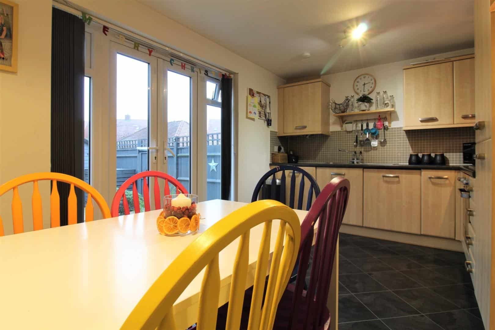 Fitted with a modern range of beech finish high and base level units with contrasting work surfaces and tiled splash back over, stainless steel one and a half bowl sink and drainer unit with mixer tap over, integrated dishwasher, washing machine and fridge/ freezer, built in stainless steel finish electric oven and gas hob with chimney style extractor over and stainless steel splash back, tile finish flooring, radiator, double glazed French doors (with matching side panels) opening out to the rear garden, wall mounted gas fired combination boiler.