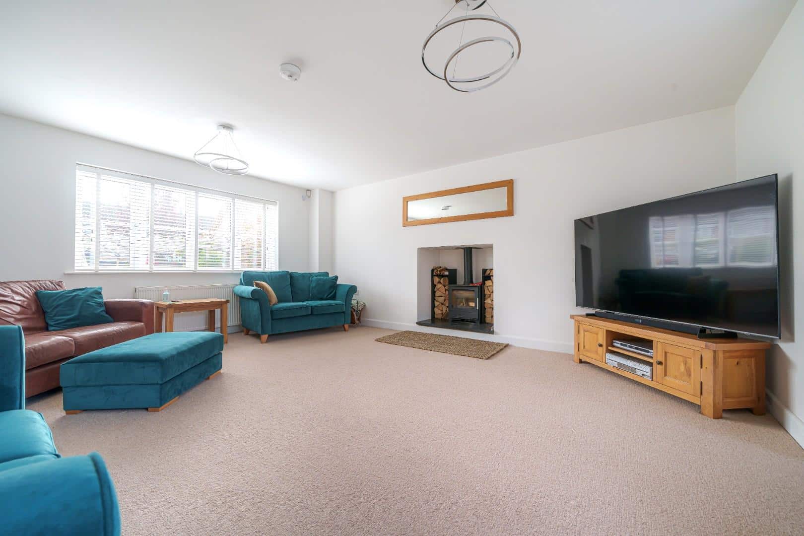 Dual aspect room with double glazed windows to both rear and front bay window aspect. Recess fireplace housing Cast iron log burner and tiled hearth. Two radiators.