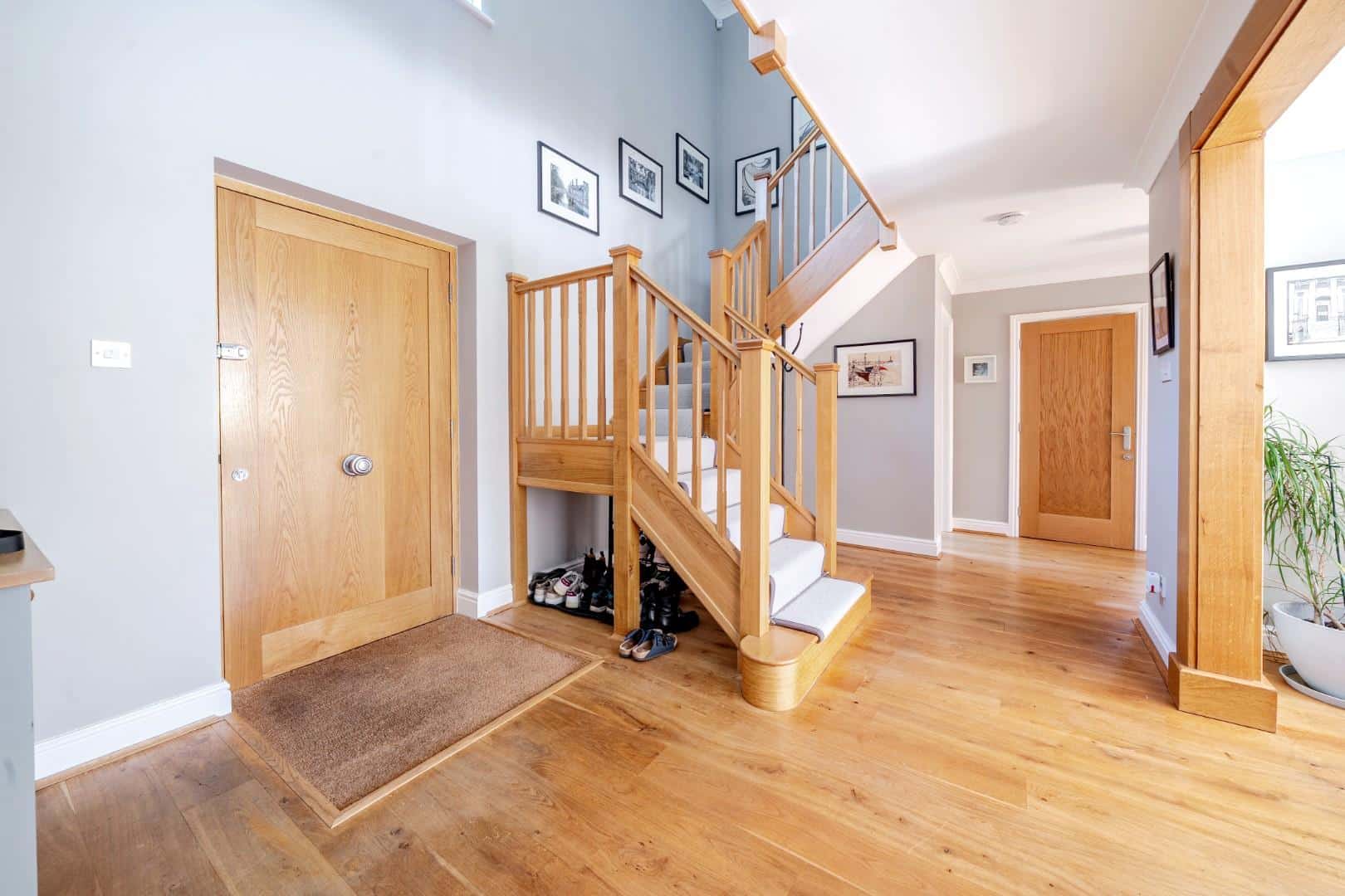 A spacious double height hallway with solid oak flooring (extending through to the dining room), oak staircase rising to the first floor landing with recess under, oak doors to cloakroom, study and kitchen, etched glass and oak framed French doors to living room and sitting room, open plan through access to dining room, two radiators and coving to ceiling.