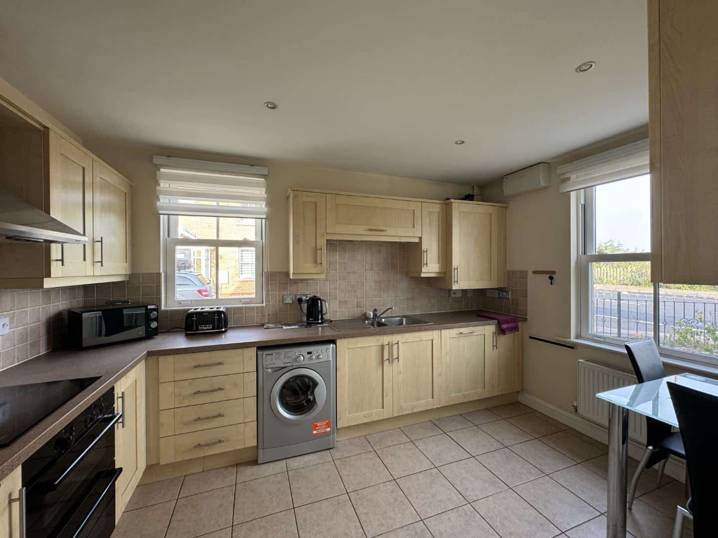 Dual aspect room with double glazed windows to both front and side aspect. Radiator. Tiled flooring.Range of fitted base and eye level units with worktops over. Intergrated double oven and four ring hob over with extractor hood. Intergrated dishwasher. Stainless steel sink drainer with mixer taps. Recess spotlights.
