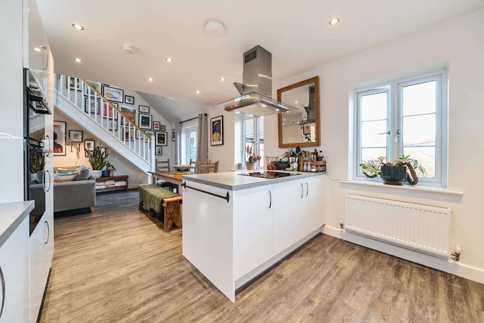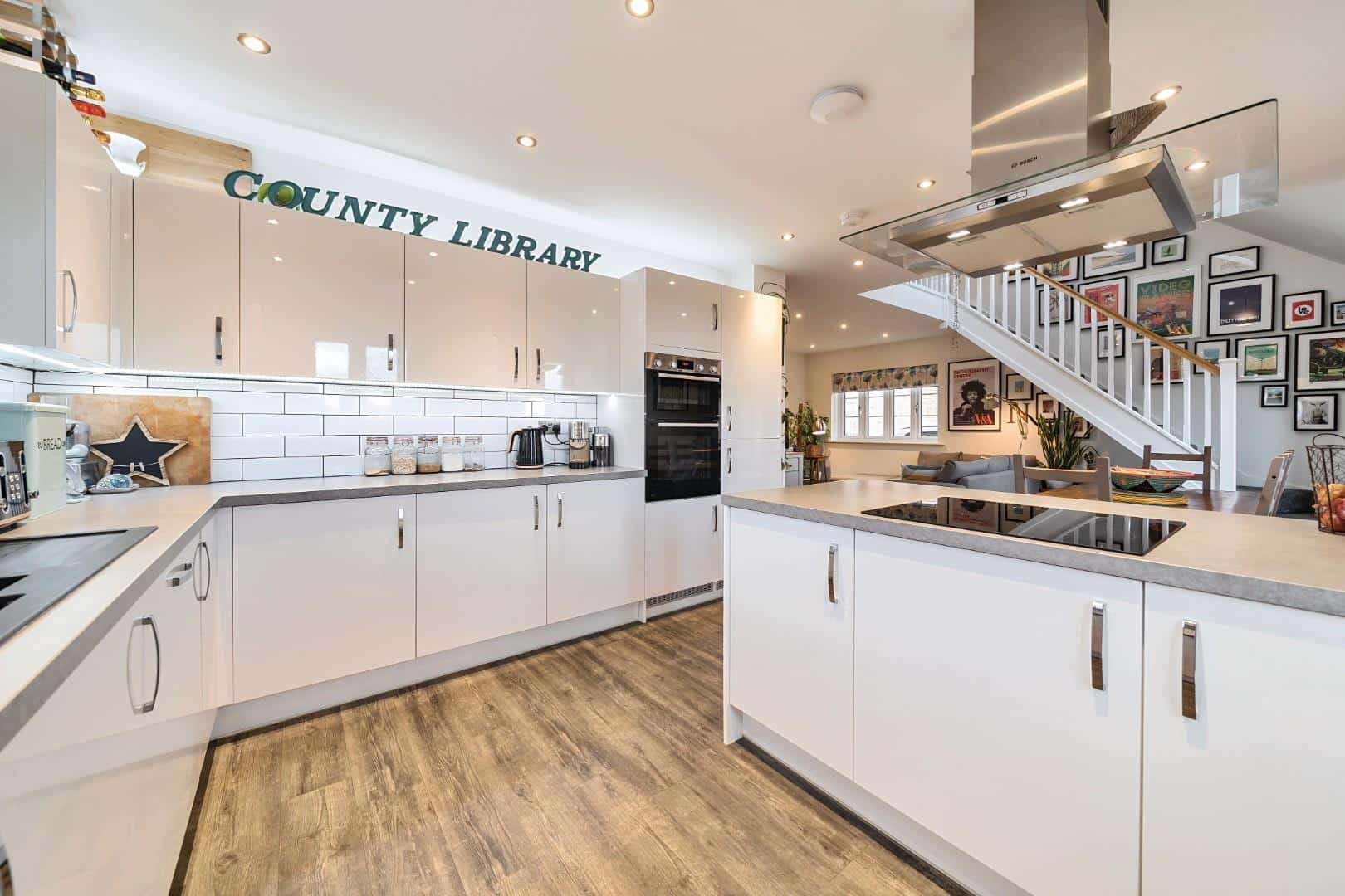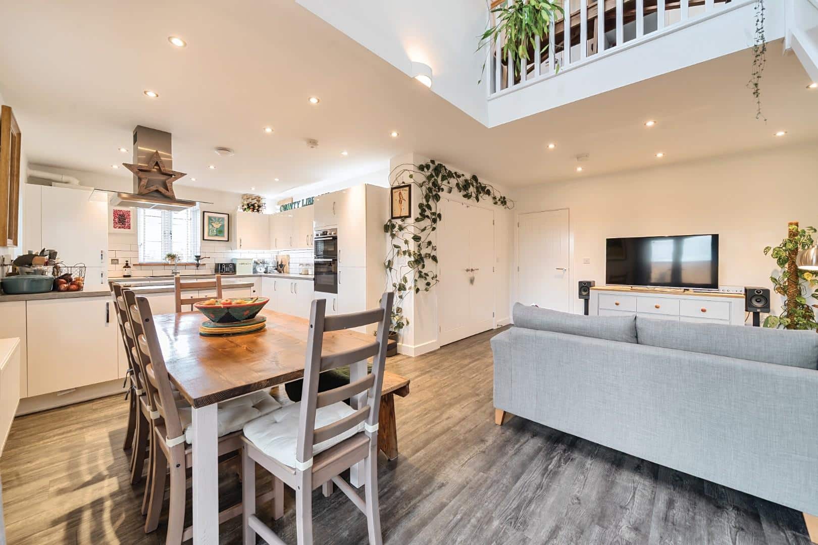 A beautiful 20′ galleried landing overlooking the kitchen/ family room, radiator and white panel doors to four bedrooms, family bathroom and airing cupboard, hatch to loft space.