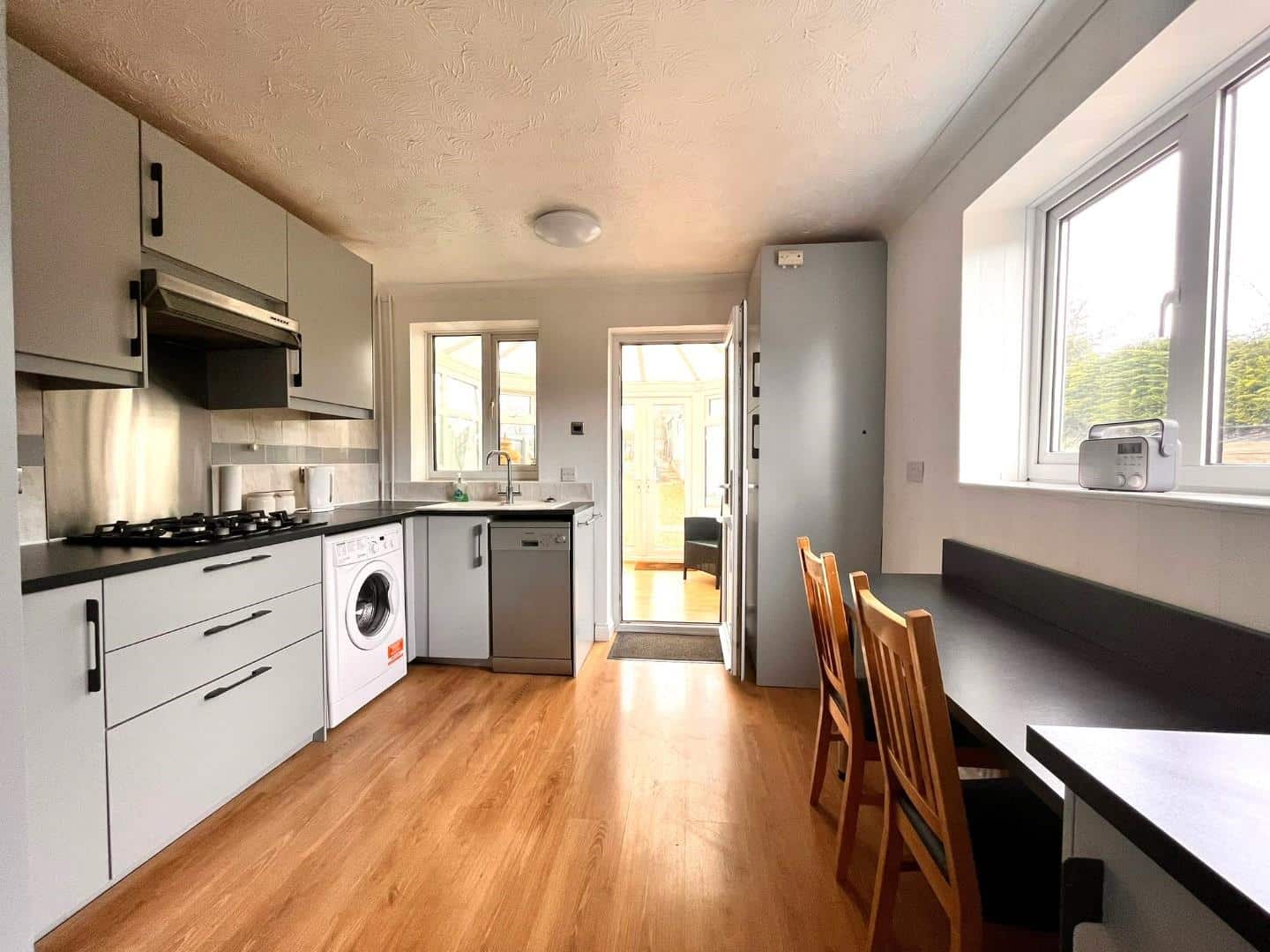 Double glazed window to side aspect. Double glazed window to rear aspect. Double glazed door to conservatory. Radiator. Wood effect laminate flooring. Inset sink drainer with mixer taps. Built in oven with microwave. Four ring hob with extractor hood over. Range of grey high gloss base and eye level units with soft close drawers and cupboards and worktops over. Breakfast bar with seating under.