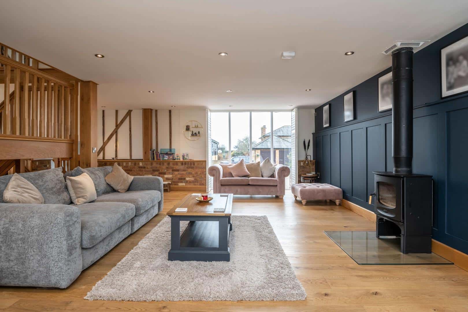 This real “Show stopping” hub of the home has an abundance of natural light. with it being triple aspect. There are three full height picture windows to rear and side aspects. The flooring is solid Oak flooring throughout with underfloor heating. Wall mounted thermostat. To the centre of the room is the “Stunning” oak dog leg staircase complete with glass balustrading. Recess spotlights. Cast Iron log burner and exposed flue with glass hearth. Double solid oak doors to kitchen. “Farm style” door to side garden.