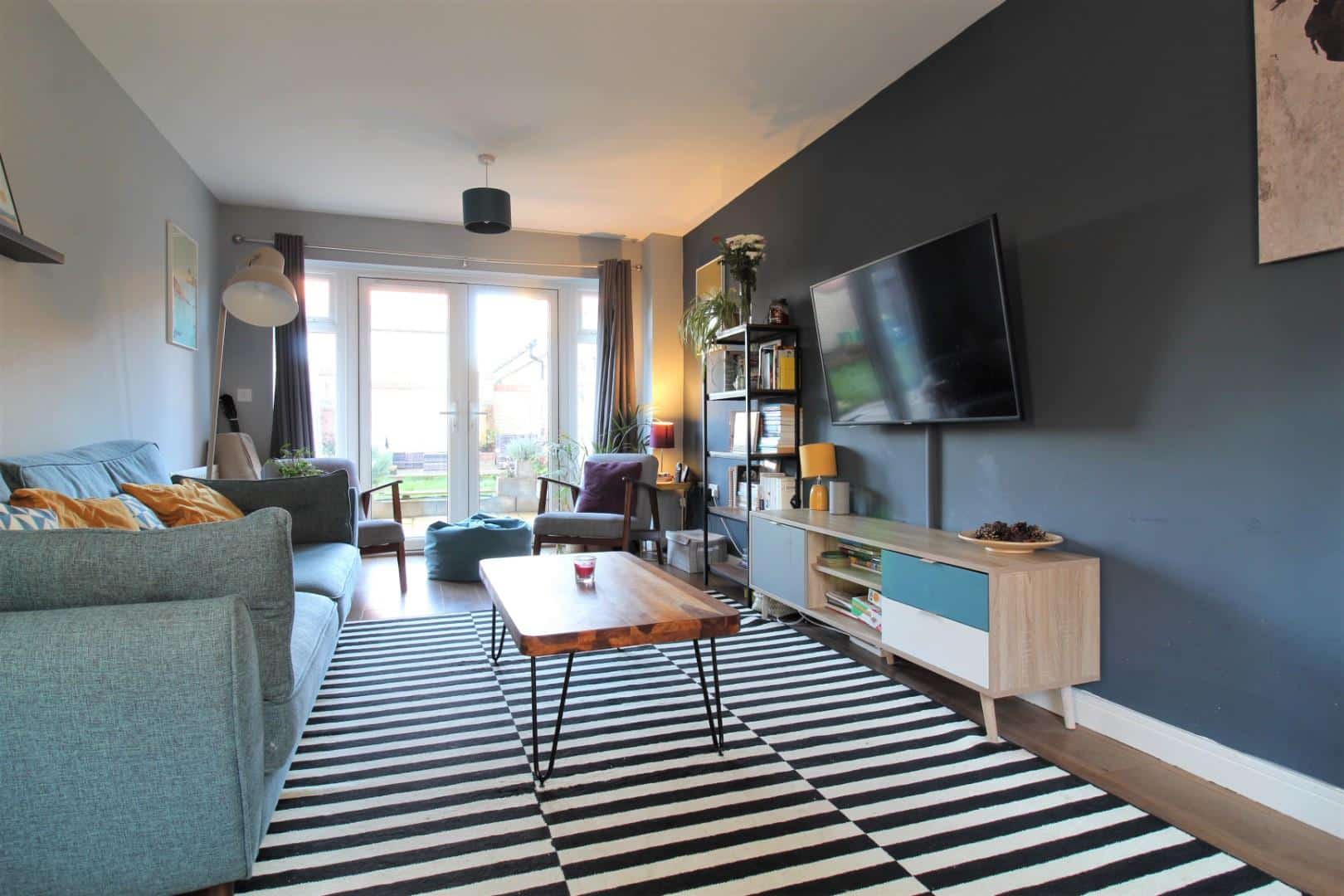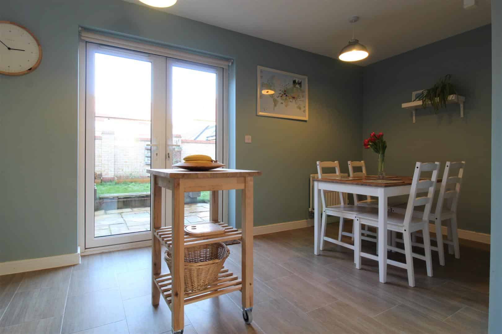A lovely dual aspect lounge with double glazed French doors opening out to the landscaped rear garden and a double glazed window to the front, two radiators and wood finish flooring.