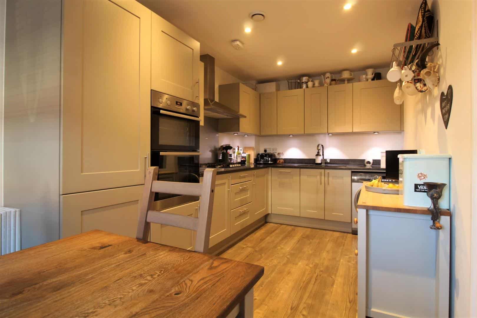 Double glazed sash and tilt window to front aspect. Radiator. Twelve spotlights to ceiling. Fully fitted and upgrade kitchen compromising of range of “Shaker Style” units with quartz worktops and feature worktop lighting over. Built in double oven. Five ring gas hob with stainless steel extractor hood over. Built in dishwasher. Built in fridge/freezer.