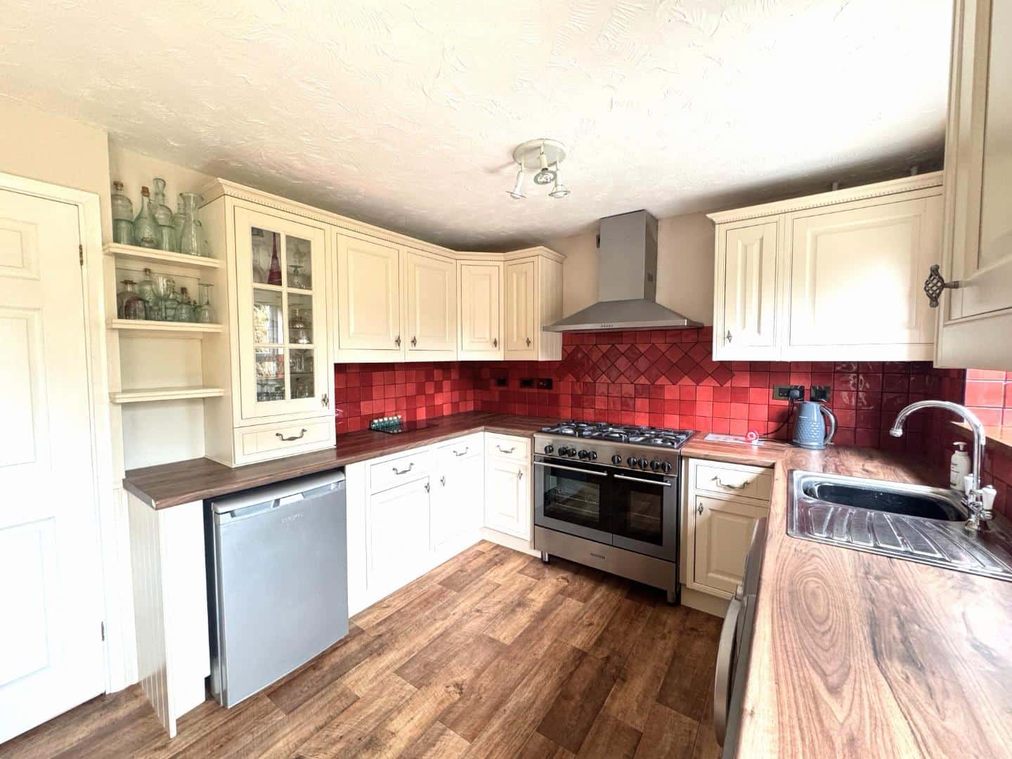 Double glazed window to rear aspect. Double glazed patio doors to rear aspect. Radiator. Wood effect flooring. Range of base and eye level units with worktops over. Fitted five ring Range style cooker with stainless steel hood over. Dishwasher. Washing machine. Cupboard housing gas boiler. Under stair storage cupboard. Stainless steel sink drainer with mixer taps.
